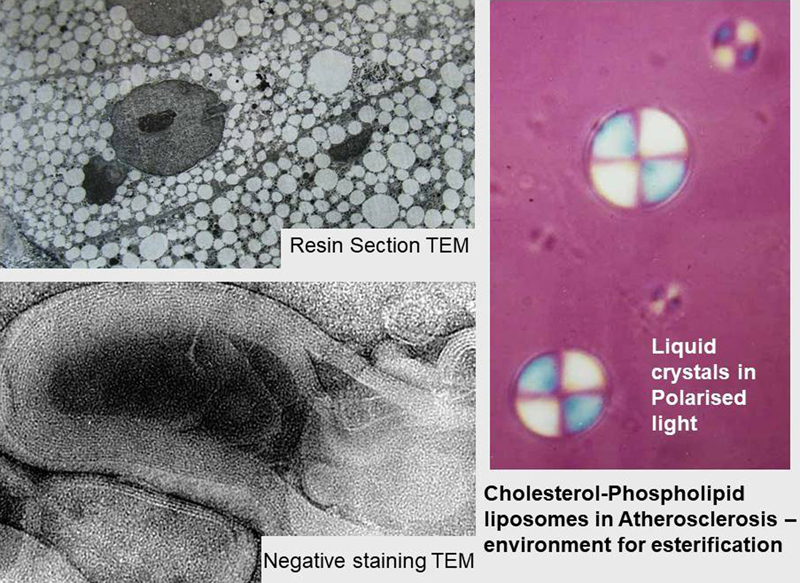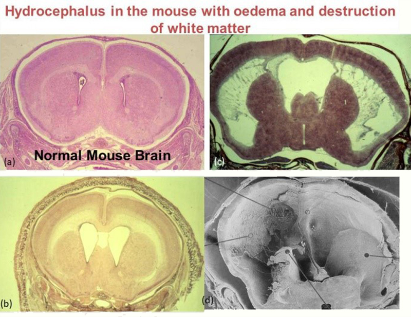 Figure 2. Intracellular lipid droplets in atherosclerosis. Top left and then clockwise: TEM showing removal of lipid from cells during preparation. Birefringent liquid crystalline droplets of cholesterol and phospholipids isolated from an atherosclerotic lesion. Similar droplets examined as negative stained TEM showing lamellated structure 2,3. US-NIH-Fellowship at the Albert Einstein College of Medicine in New York Having gained my Ph.D. in 1967, it was time for a change, so my wife, Francine, and our two children, Adrienne, aged three and Timothy aged two years embarked on a boat for the USA. I had gained an US-National Institutes of Health (US-NIH) Postdoctoral Fellowship in Neuropathology with Dr Robert Terry at the Albert Einstein College of Medicine in New York. It was a very different but highly stimulating environment. Bob Terry was very generous with his time and ideas and this led to numerous interesting discussions about pathology of the nervous system. I learned much about clinical neuropathology from Bob and his colleagues, especially Kinuko Suzuki. For my research, I investigated the effects of acute hydrocephalus upon the brains of adult rabbits, infant dogs and in biopsies from very young children. My main teacher and collaborator in this project was Henryk Wisniewski who was an excellent animal surgeon and experimenter. Henryk devised a technique for producing hydrocephalus by injecting highly viscous, but non-inflammatory, silicon oil through a lumbar intrathecal catheter into the posterior fossa of adult rabbits and young dogs to compress the fourth ventricle and impede the drainage of CSF. I examined the brains in large-area 1 μm resin sections and by TEM. By sequential examination of the olfactory bulbs in adult rabbits and the walls of the lateral ventricles in infant dogs, we showed that as the ventricles dilate in the early stages of hydrocephalus, the ependyma ruptures and the flow of CSF into the periventricular white matter results in extensive CSF oedema with a mild degree of axonal degeneration. As hydrocephalus progresses, the CSF oedema subsides and the periventricular white matter displays extensive reactive astrocytosis, and axonal degeneration 4,5. A similar sequence of changes was revealed in biopsies from very young children with acute hydrocephalus 6. These observations suggested that treating children with shunts in the early stages of hydrocephalus would preserve axons and improve prognoses. Our findings were confirmed several years later when CT scans clearly revealed the presence of periventricular oedema in the acute stages of hydrocephalus. The sequence of changes of ependymal rupture, increasing CSF oedema and destruction of periventricular white matter is well demonstrated in a congenital model of hydrocephalus in mice that I bred later when I returned to Guy’s (Figure 3).