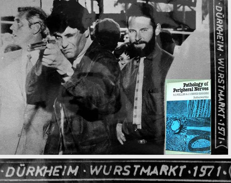 Figure 4. Neuropathology group at the Albert Einstein College of Medicine 1968. First row, left to right: Drs Kinuko Suzuki, Mariene Lenger, Krystyna Wisniewska, Kytja Voeller and Anne Johnson. Second row, left to right: Drs Roy Weller, Henryk Wisniewski, Robert D. Terry, John Andrews, Jan Leestma and Ivan Herzog. Third row, left to right: Drs Steven Shayvitz, Michael Shelanski, Richard Snyder, John Prineas and Carlos Araoz. I have Kinuko-Suzuki to thank for my much of my training in diagnostic neuropathology and for her friendship that lasts to the present day. Of the younger members of the team, Michael Shelanski became Professor of Pathology at Columbia University in New York, John Prineas returned to Australia as a Neurologist in Sydney to continue his research on multiple sclerosis. Jan Leestma developed a very successful career in Forensic Neuropathology in Chicago; we are still in contact. After the photograph in Figure 4 was taken, Cedric Raine and Peter Spencer joined Bob Terry’s Department. Cedric developed a very successful career in multiple sclerosis research. Peter Spencer moved into Toxicology and together with Herb Shaumburg published a large multi-author book on Clinical and Experimental Neurotoxicology to which my colleague in Southampton, John Mitchell, and I contributed a chapter on a fascinating Mexican segmental demyelinating neuropathy due to ingestion of fruit and seeds of the Buckthorn plant (Karwinskia humboltiana) 8. It was rumoured that Mexican women would administer small amounts of the fruit or seeds to their husbands so that that they would feel weak and stay at home rather than spending the evenings drinking with their friends. Return to England In the fall of 1968, my family and I returned to England and I was appointed Lecturer in Pathology at Guy’s Hospital Medical School. I continued my close connections with Neuropathology by working in Peter Daniel’s Department at the Institute of Psychiatry in London. My joint appointment allowed me to learn much from Peter and from his colleagues. I also broadened my knowledge of clinical diagnostic pathology in general by engaging in the analysis of renal biopsies in collaboration with David Turner, a fellow Pathologist, and Renal Physicians, Stewart Cameron and Chisholm Ogg. This was a very fruitful time as correlation of the ultrastructural changes in renal biopsies with clinical syndromes was still in its early stages. Together with Barry Nester, I published mid-20th-century diagnoses for three post-mortem kidneys that had been preserved by Richard Bright in the 1820-30s 9. For me, this was a valuable time for establishing contacts in London and elsewhere in the UK and for considering my ultimate career. During the 1970s I started to regularly attend conferences abroad, mainly in Europe. This was essential for my continuing education and for maintaining contact with colleagues. I also benefitted by visiting many interesting countries and cities and meeting a great variety of different people. In 1971, I was fortunate to spend a short period in Berlin with Jorge Cervós Navarro that not only greatly increased my experience in neuropathology, but also allowed me to appreciate life in East Berlin, then in the Soviet bloc, and to visit the famous Pergamon Museum and its marvellous exhibits from Ancient Greece. It was through Jorge that I was introduced to the German Neuropathology Society. At this time, trips to interesting nearby attractions were a feature of the German conferences. Following a meeting in Heidelberg, for example, we visited Bad Dürkheim and the Dürkheimer Wurstmarkt (sausage market but in reality the world’s largest wine festival) (Figure 5). I retained contact with Jorge for many years and together we wrote a book on the “Pathology of Peripheral Nerves” that was published in 1978.