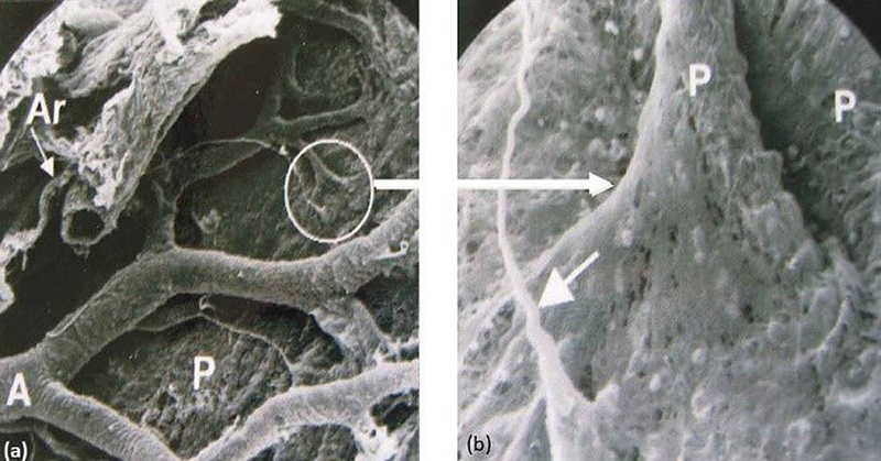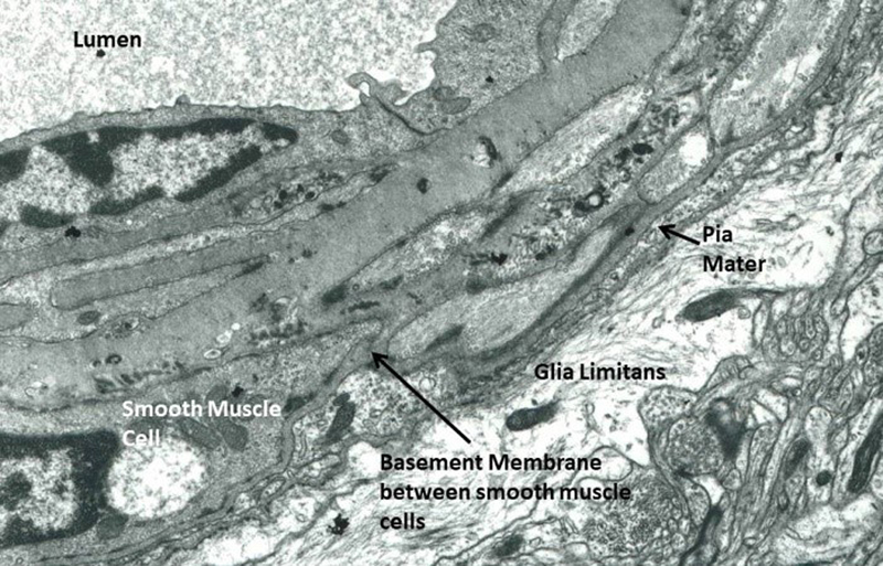 Figure 7. SEM of the meningeal surface of the human cerebral cortex showing the arachnoid mater (Ar) and branches of an artery (A) spreading over the surface of the pia mater (P). The circle depicts the point at which a branch of the artery enters the cortex and how the pia mater is reflected on to the artery thus separating the subarachnoid space from the brain. (b) is an enlarged view of the reflected pia mater (P). Artefactual holes are seen in the pia in this post-mortem specimen. Arrow (lower left) identifies a filiform trabecula crossing the subarachnoid space 10. In the 1980s, En-Tan Zhang came from Beijing to work with me in Southampton. En-Tan is a medically qualified Anatomist and he made a major contribution to establishing the relationships between the leptomeninges and arteries as they enter the brain. Using well fixed human biopsy brain material, En-Tan showed that a single layer of pia mater coats arteries as they enter the surface of the cerebral cortex and that there is no “periarterial space” between the glia limitans and the artery wall 13. Astrocytes in the glia limitans, pia mater, smooth muscle cells and endothelium together with the intervening layers of basement membrane form a compact structure, with no perivascular space (Figure 8). The long-described Virchow-Robin spaces do not exist in the cortex and if present they are mainly due to swelling of astrocyte processes from poor fixation as emphasised by Milton Brightman in the 1960s. En-Tan’s observations completely changed our perception of the relationship between CSF and the brain. Subsequently, Roxana Carare’s group showed that tracers from the CSF enter the brain, not along perivascular spaces (as there are none) but along basement membranes between the glia limitans and the single layer of pia mater that surrounds each artery as it enters the brain 14. Basement membranes between smooth muscle cells in the tunica media were later shown by Roxana Carare to be the pathways for flow of fluid and solutes out of the brain. Due to the absence of periarterial spaces, there are no periarterial pathways for the entry of inflammatory cells from the CSF into the brain. Periarterial spaces do form in other the parts of the brain, especially in the basal ganglia and around arteries in the white matter. At both of these sites, arteries are surrounded by two layers of pia mater and the periarterial space develops between them 15,16.