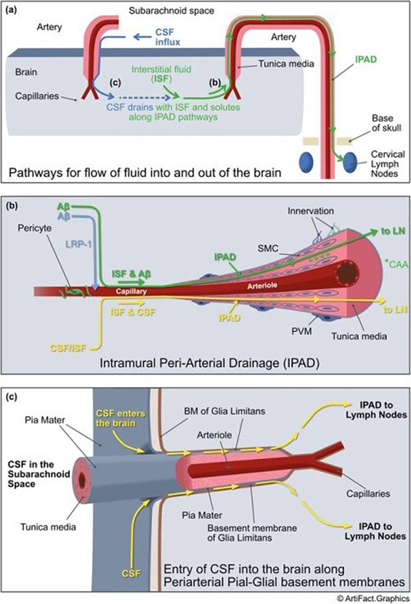 Figure 9. Summary of pathways for the flow of fluid and solutes into and out of the brain. (a) CSF flows into the brain along basement membranes shared by pia mater and glia limitans on outer surfaces of cortical arteries as they penetrate the brain. (b) Interstitial fluid (ISF) and solutes such as Aβ flow out of the brain to lymph nodes along IPAD pathways. (c) Details of the pathway by which CSF flows into the cerebral cortex along pial-glial basement membranes and then enters the brain to flow out along IPAD. Reproduced from 29. Original Design by Roy Weller and graphic by ArtFact Graphics. Award of the Gertrud-Reemtsma prize for International Translational Neuroscience 2020