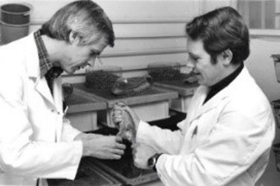 Gade’s Staff around 1980, ‘none mentioned, none forgotten’. Exception: Professor emeritus Erik Waaler, in front, who discovered the Rheumatoid Factor in 1939. He went to Bergen and opened the Medical Faculty here in 1947. An open mind A touch of subjectivity is inherent in histopathological diagnoses. A reality is evidenced through inter-observer as well as intra-observer variance in histopathological assessments. Since I am easily influenced, I long ago settled into a routine of ignoring the specimen’s clinical, anamnestic data. My policy is to grab the object glass, glance at the slide on its way to the position between light source and objectives. To look through the microscope before reading at the clinical data (age, gender, actual problem et cetera) is My Way to lower bias in reading the histology. That is, before I acknowledge the clinical problem, and the eventually suggested, tentative diagnosis (TX). Starting every biopsy assessment with an open mind, trying to decide the source of the material (organ?), then a quick glance for changes, has worked well for me. It is not a time-consuming ordeal, one second, sometimes a few, does it. The trick is to convert the evaluation (reading) of every biopsy specimen into an internal competition. This habit makes the daily workload fascinating to handle. I’ve not had a single day of boredom in the company of my microscope and a carefully produced tissue section. I’d say that this habit (modus operandi) has fed alertness and positivity. In my office I had two computer screens in front of me. One hooked up to the Pathology Department and the other connected to the servers of the University for surfing the web to keep updated. In this way I could confer with the newest data without having to shut down the one with sensitive patient information. As mentioned before, the BDIX rat was an asset that Laerum used to the fullest extent for the years to come. The breeding of the BDIX rats was in the hand of animal technician Tore-Jacob Raa. He kept breeding 35 generations! The +40-year-old photo shows us injecting tumour cells intraperitoneally: