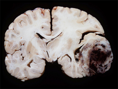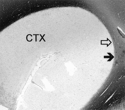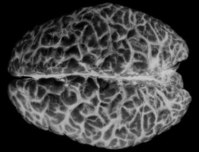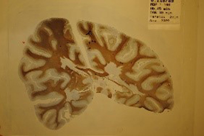Above, a thin (20μ) coronal brain sections immunostained for myelin (dark brown). It shows bilaterally irregular, and sharply bordered, large, demyelinated areas adjacent to lateral ventricles. Look closely and you will notice the amount and variation of the widespread myelin deficits in the cortex.
