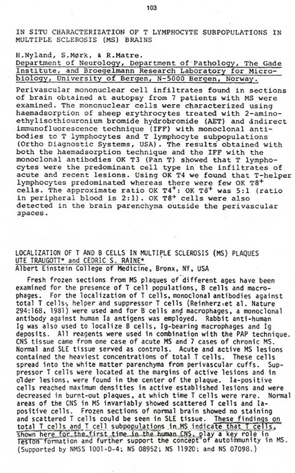 After the session closed, I was told that this person was known to act rudely/impolitely in discussions. He, a virologist, from the US West Coast, was Mikkel Gammelsten (name changed to Old Norse by me). I still remember the few neuropathologists who patted my back afterwards. But this unpleasant occurrence is still with me. To cure ‘it’, I reset my focus to the message we presented in 1982. The Cedric Raine group penned it for us: ‘T cells, shown here for the first time in the human CNS’. We could not have written it better ourselves.