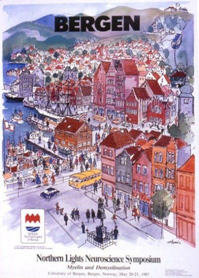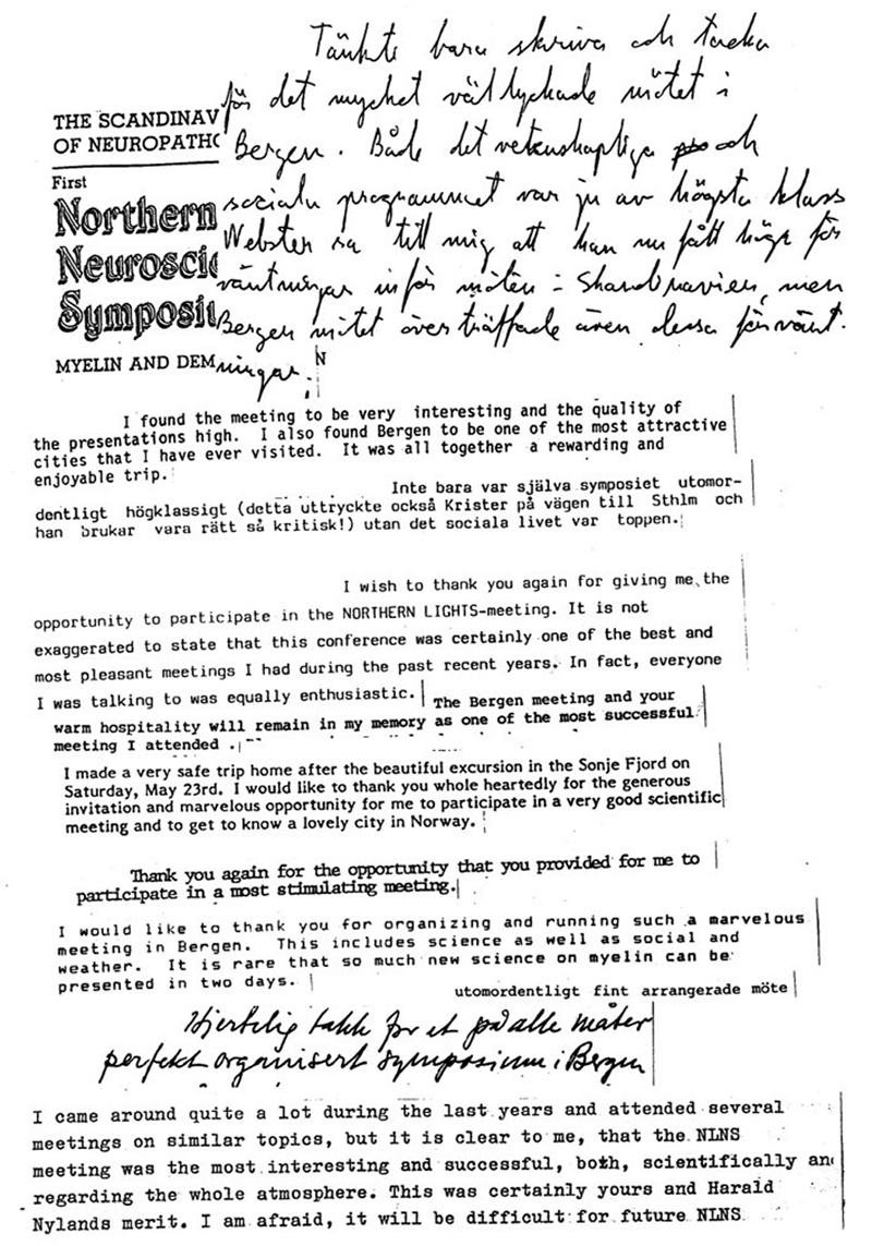 Now it pleases me to look back on that afternoon session in Vienna 40 years ago and re-establish the fact that our group from Haukeland University Hospital (Harald Nyland, Department of Neurology), Roald Matre (Immunologist, Broegelmann Research Laboratory, and I) were the ‘first’ to show evidence that T-cells were at the site of MS lesions. We even gave an estimate of the ratio (5:1) between helper and suppressor lymphocytes, as well as presenting CD8 positive cytotoxic T-cells in the parenchyma. Our findings were published in a letter to the editor under the heading ‘T lymphocyte subpopulations in multiple sclerosis lesions’ in December 1982 (New England Journal of Medicine 307:1643-1644, 1982) and those of Traugott and Raine in January 1983. This fact seems forgotten in most references to this topic. The results presented in Vienna 1982 have been repeatedly confirmed during later years. In 1986 the Scandinavian Neuropathological Society hosted the Xth International Congress of Neuropathology. This meeting took place in Stockholm, Sweden with Patrick Sourander as President of the congress. It was a huge success, scientifically as well as financially, not least through the economic efficacy of Yngve Olsson. To my knowledge, the number of participants (1,300) have never been surpassed by later International and European Neuropathology congresses. In 2002 our Society hosted the Euro-CNS meeting in Helsinki, Finland, with Matti Haltia and Hannu Kalimo as chief organisers. The 12th European Congress of Neuropathology was organised by Bjarne Winther Kristensen, Denmark from May 31st – June 3rd 2021. Our Society also organises the Northern Lights Neuroscience Symposia. VI: Northern Lights Neuroscience Symposia During the preparation for the 1986 event in Stockholm, the idea came up to start a high-quality series of Neuroscience Symposia. I took the challenge of organizing the first such meeting. My cooperation with neurologist Harald Nyland had focused on Multiple Sclerosis for some years, and it was convenient to select themes related to this disease. The leader Gerd Hagen of the Norwegian MS Society provided financial support so we could invite active researchers from any country to give the newest research in their field of expertise. All the 17 internationally acknowledged scientists complied with our invitation to contribute to the First Northern Lights Neuroscience Symposium. The scientific focus was ‘Myelin and Demyelination’. One of the invited, Bruce D Trapp, would turn out to be a valuable research partner for the next 30 years!