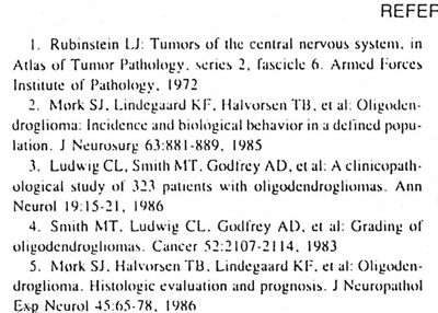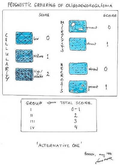 One evening, Peter Burger, Bernd Scheithauer, Roy Weller and I discussed criteria for grading oligodendroglioma among other things. Bernd and I agreed to take this further. We wanted to do an ‘Oligo Study’ (Heading of a letter from Bernd to me, July 9th, 1990) comparing different grading systems. I had the impression that ‘my’ system would be part of the study, but something went wrong. I am not sure what it was. The study was now ‘Oligodendroglioma Grading Project’. In the summer of 1993 I had fulfilled my contribution to the somewhat changed study/project. Caterina Gianinni compiled the input from six neuropathologists and six surgical pathologists and was the first author of ‘Oligodendrogliomas: Reproducibility and Prognostic Value of Histologic Diagnosis and Grading’ (Journal of Neuropathology and Experimental Neurology 60(3):248-62, 2001).