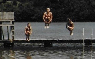 As the time went by, I felt more relaxed, especially during the weekends. This ‘saturday in the office’ posture was more casual than necessary. Note the small microscope compared to the ‘monsters’ of today. Family life in Charlottesville expanded just a few days after Kari, Pia, Ine and Erik’s arrival in the US on August 11th 1983. We rented a townhouse in ‘Four Seasons’ just outside the Charlottesville city limits. After a few days, we found out about a lake not too far away. At Chris Green Lake we enjoyed cooling off in the hot and humid August with swimming and making ‘bombs’ (pictured here). On the first day in the water, a passing young swimmer asked our girls if they were from Norway. Her mother was. The young girl came up to us on the beach with the telephone number to her home. One phone call and we quickly got anchored to people that we still have as friends, close to 40 years later.