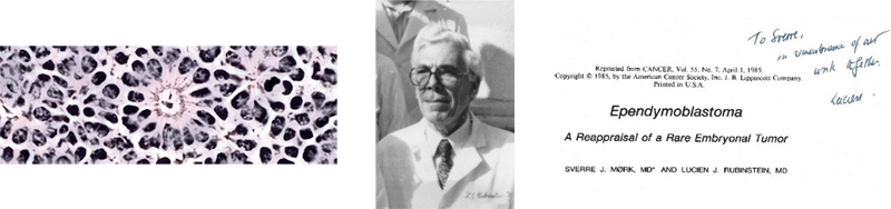Other social activities: the head of Neurological Surgery (John A Jane) was exceptionally gracious. I was able to attend two of his garden parties. ‘Christmas in June’ was a yearly event hosted by ‘DR. AND MRS. JOHN A. JANE’. It was a fantastic party, which people looked forward to for weeks. In a corner of their huge lawn, a Dixieland Band entertained with feel-good vibrations. There was plenty of food and beverages. Some persons even followed the suggested theme of the party for ‘OPTIONAL MASQUERADE AND/OR MASKS.’ The Christmas Party in June was an extraordinary successful socialising event. I was introduced to many interesting people. I recall: ‘You have to meet Lennart Heimer, he is from Sweden, and has recently published a Neuroanatomy textbook.’ I had not heard Heimer’s name before. His ‘The Human Brain and Spinal Cord: Functional Neuroanatomy and Dissection Guide’ had just been published in 1983. The reviews were excellent and so was the book, which I promptly acquired. Lennart’s wife was Norwegian, and there were further Scandinavian ladies married to American scientist and businessmen. They met once a month, and Kari was wholeheartedly taken in. In our Four Seasons neighbourhood we connected to neighbours with children from abroad, like Peru, Israel, Finland, and Canada. After a harsh start, our two girls thrived in the public Jack Jouett Middle School. They were considered just very shy Americans. After those first awkward weeks, things turned around. Neuropathology continued Lucien’s office was relatively modest in size, soft-coloured interior, decorated in beige and brown. A two-headed microscope was the first thing you saw when entering this sacred place. You did not want rush in there. I felt tension in the air from the start. (Was it only me?) However, I found the weekly review of the recently arrived consultation cases (‘CCs’) most educational. Brain tumour cases came from all over the world. The fellows and I were assigned cases for presentation at the review meeting, and I greatly valued the scholarly discussions related to these rare and mostly difficult cases. The significance of patterns and elements of the microscopic changes were deliberated in extenso. Back at our desks, we dictated microscopic descriptions and diagnoses. The front page, for the ease of the submitter to see, gave a clear conclusion/diagnosis. This was followed by a very wordy description to ensure that every possibility was taken into consideration. Rubinstein’s wordings in letters to editors (and others) were polite, starting and ending with ‘Thank you for’ with interspersed ‘...would you be so kind as to…’, and ‘…please find...’, a custom I have adopted which has suited me well. Another matter was his quest for excellence in microphotography with many retakes and increases of magnification (‘go to a higher mag!’). He typically stressed the fact that you are writing for educated and interested readers, so you do not have to explain everything. Trust that your audience is ‘level’. I recall a special incidence: At the double microscope, he rubbed his face and moaned over the quality of the tissue section we were looking at. A long silence, and then ‘Who ordered the lab to do this (immunostaining, my comment) GFAP?’ I did. More moaning, then: ‘Technicians must respect the persons who give them orders’, meaning that he himself had to order immunohistochemistry if he wanted the result to be ‘perfect’. In other words, I was not respected. A deep sadness hit me, I felt both bad and sad. ‘They’re like animals’ he said. I thought I didn’t hear right! Lucien was unique in his position as a world authority on brain tumours with a more than complex personality, not without ‘musicality’ and a sort of sweetness and vulnerability. In January of 1990, Lucien J Rubinstein died at 65. The eulogy, written by Scott R Vandenberg, Bernd W Scheithauer, and Darrell D Bigner, has a passage that I would like to share with you. ‘Lucien Rubinstein had a remarkable dramatic presence. Not many people could fail to remember the first encounter with him. All were affected by his charming manner, subtle and, at times mischievous wit, or lancinating wrath’. My wife would easily have stayed in Charlottesville for another year or two. I, however, longed for doing neuropathology and diagnostic surgical pathology back home. (Two Roads) Lucien had a special liking for embryonal tumours, so I’ll close the UVA experience with three images.