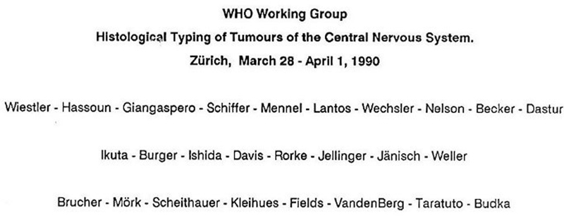 After publication of the oligodendroglioma papers in JN and JNEN, many neuropathologists and neurosurgeons reacted in a positive manner. I gave ‘oligo-talks’ in Europe and in the States. Following one in in Memphis, Tennessee, the neuropathologist, F Curtis Dohan Jr, wanted to discuss some interesting cases with me. Entering the microscopy room, I was met by a 12-headed microscope loaded with 10 residents. Ten (!)and all were residents of the largest neurosurgical department in the Southern US. The cases ‘Curt’ had sought out for discussion were certainly not straightforward. I remember that we had lengthy discussions before concluding. Thinking back, I must say that the quality of questions and comments from those mainly neurosurgical residents surpassed anything I had experienced before. The 1990s Two key events in My Way occurred in 1990. In January I received an invitation from Paul Kleihues (Zurich/Lyon) to participate in a brain tumour meeting in Zurich. The invitation had a questionnaire attached, where you answered, ‘by circling the answers which correspond best to your current opinion on classification and grading’. At the end of March 1990 Paul called together a WHO Working Group to discuss Histological Typing of Tumours of the Central Nervous System. The main purpose was to get consensus on the nomenclature to be used in the next version of the IACC brain tumour classification. Although the meeting took place more than 30 years ago, you can recognise the expertise of the participants by reading some of the last names in the official photo. Scott Vandenberg sat in for Lucien Rubinstein who died in January 1990. There were slide-viewing sessions, short presentations on specific problems followed by panel discussions, and occasional decisions by voting. For me, a highly educational and excellent experience.