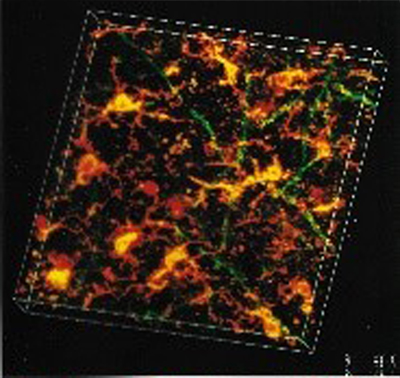 This slightly tilted 3D presentation shows a very active cortical MS lesion; the most active picture I have seen. Microglia is in red, and myelin is in green. The yellow colour signals co-localisation. The morphology is clearly that of acutely activated microglia engulfing myelin. Think about this image as a point in time in a video, with a dynamic remodelling of the cytoplasm, with extensions and retractions in an undulating mode. It goes from slim microglia via this morphology to full-blown macrophages. Hopefully methods of the future will start to bring us nearer to the ultimate goal: To unravel the mystery of Multiple Sclerosis.