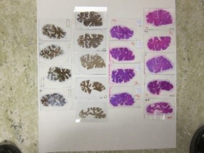 Research related to brain tumours, and MS have been closest to my heart. In cooperation between the Norwegian Multiple Sclerosis Competence Centre and the Norwegian MS Registry & Biobank, we have organised CNS material for research purposes. We have stored clinical data, paraffin blocks, stained, and unstained slides from more than 40 persons with MS. In many cases bioengineers Brynhild Haugen and Laila Vårdal embedded whole coronal sections from MS brains into paraffin. They are cut by a large sliding microtome (not many of them around) into 20μ sections, mounted on glass slides in glycerol, and cover slipped for microscopic analysis. The manoeuvring via water bath to glass is technically challenging, as is the staining process. The images (above and below) show how it can be done!