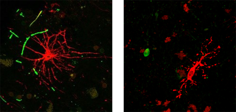 To me it looks as if the players in demyelinated foci have their own agenda! To the left, a single reactive astrocyte dominates the field with scattered myelin rests. (Two intact internodes?). To the right you see a tiny myelin debris in a cortical (autofluorescence) field with total loss of myelin and a solitary microglia cell (watch dog) with multiple tiny cell processes, which do not signal activation. What happened to the myelin? One can wonder… then I consider: what about the bioactive substances that are present in the same spot, untagged?