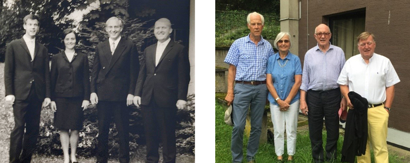 Sverre, Sabine, Hans, and Peter minutes after the last examination, 1967, and 50 years later (2017). The 12th semester was a tough stretch of examinations, all oral, 19 in all. We were examined in groups of four (the same four students during the whole ‘Staatsexamen’). We all did well. Here, in the summer of 1967, we were a relieved and happy quartet standing in front of my 11m2 studio after the very last examination.