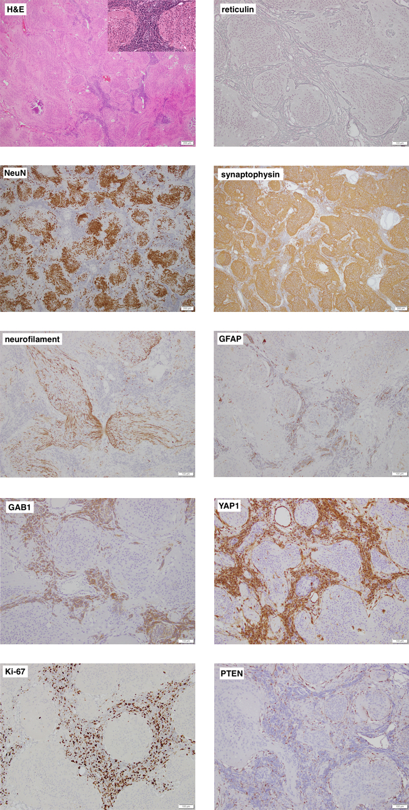 Abstract Cowden syndrome (CS) is an autosomal dominant hamartoma and tumor predisposition syndrome caused by heterozygous pathogenic germline variants in PTEN in most affected individuals. Major features include macrocrania, multiple facial tricholemmomas, acral and oral keratoses and papillomas, as well as mammary, non-medullary thyroid, renal, and endometrial carcinomas. Lhermitte-Duclos disease (LDD), or dysplastic gangliocytoma of the cerebellum, is the typical brain tumor associated with CS; the lifetime risk for LDD in CS patients has been estimated to be as high as 30%. In contrast, medulloblastoma is much rarer in CS, with only 4 reported cases in the literature. We report a 5th such patient. All 5 patients were diagnosed between 1 and 2 years of age and not all showed the pathognomonic clinical stigmata of CS at the time of their medulloblastoma diagnosis. Where detailed information was available, the medulloblastoma was of the SHH-subtype, in keeping with the observation that in sporadic medulloblastomas, PTEN-alterations are usually encountered in the SHH-subtype. Medulloblastomas can be associated with several tumor-predisposition syndromes and of the 4 medulloblastoma subtypes, SHH-medulloblastomas in children have the highest prevalence of predisposing germline variants (approx. 40%). CS should be added to the list of SHH-medulloblastoma-associated syndromes. Germline analysis of PTEN should be performed in infants with SHH-medulloblastomas, regardless of their clinical phenotype, especially if they do not carry pathogenic germline variants in PTCH1 or SUFU, the most commonly altered predisposing genes in this age-group. In addition, these cases show that CS has a biphasic brain tumor distribution, both in regards to the age of onset and the tumor type: a small number of CS patients develop a medulloblastoma in infancy while many more develop LDD in adulthood. Case history The patient was born at term after an uneventful pregnancy; however, she was noted to have pronounced frontal bossing and macrocrania, (head circumference > 98th percentile). She presented at age 15 months because of rapidly increasing head circumference. MRI showed an extra-axial posterior fossa mass within the cisterna magna, measuring 5.3 x 4.4 x 3.2 cm. The tumor was resected; post-operative MRI confirmed gross total resection. Histologically, it was a medulloblastoma with extensive nodularity (MBEN). She was treated according to the CCG-99703 protocol, which consists of 3 cycles of induction chemotherapy followed by 3 cycles of marrow-ablative consolidation chemotherapy with autologous stem-cell rescue [Cohen et al. 2015]; however, she only received 2 of the latter due to hematological toxicity. During follow-up, some keratotic papules on the fingers and buttocks were noted and therefore Gorlin syndrome (nevoid basal cell carcinoma syndrome; Online Mendelian Inheritance in Man (OMIM) #109400) was suspected clinically. Some of these cutaneous lesions were biopsied but consisted of non-specific keratoses or warts; there were no basal carcinomas. Initial germline genetic testing at age 2 consisted of deletion analysis and Sanger sequencing of PTCH1, which were negative. Sanger sequencing of SUFU was done at age 5 and was negative. At age 8, a firm papule was noted on the neck; histologically, it was a sclerotic fibroma. (A similar lesion was also noted on the left thigh, but not excised.) At age 9, four palmar pits were noted on the right hand. Although the combination of palmar pits, MBEN, and macrocrania was suggestive of Gorlin syndrome, sclerotic fibroma has been associated with Cowden syndrome (CS; OMIM #158350) [Kieselova et al. 2017]. Therefore, next-generation germline sequencing of PTCH1, PTCH2, SUFU, and PTEN was performed. A previously reported pathogenic variant in PTEN, c.388C>T, p.R130* (COSV64288463), was identified. No variants were found in the other genes. Parental studies were negative, suggesting most likely a de novo mutation, although gonadal mosaicism in one of the parents cannot be ruled out. At age 10, a posterior fossa dural arterio-venous fistula (DAVF) was suspected on a routine follow-up MRI and confirmed by cerebral angiogram to be a Borden type 1 DAVF draining into an ectopic pouch of the right transverse sinus; it was fed by branches of the right and left external carotid arteries and the right posterior cerebral artery. Although hemorrhage from intracranial AVFs has been reported in patients with CS [Prats-Sánchez et al. 2016], Borden type 1 DAVFs have a very low risk of hemorrhage [Gandhi et al. 2012] and the lesion was completely asymptomatic. It was therefore not treated. It was no longer seen on repeat imaging a year later, suggesting spontaneous involution-resolution. At age 12, multiple thyroid nodules were noted bilaterally on ultrasound; fine needle aspiration cytology was consistent with benign follicular nodules. Now age 13 (i.e., 12 years post-diagnosis), the patient is alive and well without evidence of recurrent medulloblastoma. She does not have facial or oral lesions. Figure 1. Representative images of the cerebellar tumor’s histology and immunophenotype. Individual images are labelled with the respective stain. On low power, the tumor is biphasic and distinctly nodular. Most of the tumor is made up of neurocytic to gangliocytic cells (high power inset) that are strongly NeuN immunoreactive and embedded in a synaptophysin-positive neuropil-like matrix that contains bundles of neurites. The highly cellular desmoplastic component shows some staining for GFAP and is strongly positive for GAB1 and YAP1. Ki-67 labelling is seen almost exclusively in the desmoplastic component. Both components lack expression of PTEN, which is retained in endothelial cells. Clicking the figure will lead you to the full virtual slides. Pathology Representative images of the cerebellar tumor are shown in Figure 1. The tumor was biphasic and had a distinctly nodular growth patte