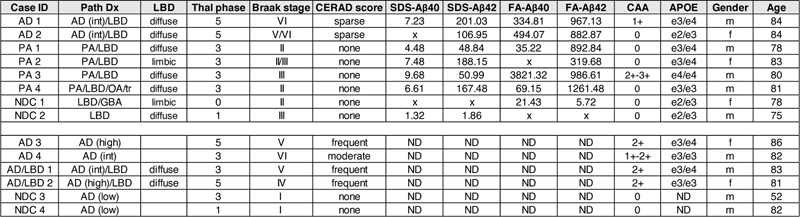 Background: Seeding of pathology related to Alzheimer’s disease (AD) and Lewy body disease (LBD) by tissue homogenates or purified protein aggregates in various model systems has revealed prion-like properties of these disorders. Typically, these homogenates are injected into adult mice stereotaxically. Injection of brain lysates into newborn mice represents an alternative approach of delivering seeds that could direct the evolution of amyloid-β (Aβ) pathology co-mixed with either tau or α-synuclein (αSyn) pathology in susceptible mouse models. Abbreviations AD - Alzheimer’s disease, LBD - Lewy body disease, AD/LBD - Alzheimer’s disease/Lewy body disease, Aβ - amyloid-β, αSyn - α-synuclein, APP - Amyloid precursor protein, PA - Pathological Aging, GFAP - Glial fibrillary acidic protein, MAPT - Microtubule-associated protein tau, NDC - Nondemented Controls, WT - Wild type, CAA - cerebral amyloid angiopathy, ELISA - Enzyme linked immunosorbent assay, SDS - Sodium dodecyl sulfate, FA - Formic acid, Thio-S - Thioflavin S. Background The amyloid cascade hypothesis posits that deposition of the Aβ peptide is an initiating factor in Alzheimer’s disease (AD) with downstream effects of increased inflammatory response, altered neuronal homeostasis, altered tau phosphorylation leading to tangle formation, neuronal dysfunction, and cognitive decline (1, 2). The interaction between Aβ and tau pathology has been modeled in transgenic animals that co-express human amyloid precursor proteins (APP) with mutations associated with familial AD (FAD) and wild-type or mutant human tau (3-12). Multiple studies report that the presence of Aβ pathology exacerbates the severity of tau pathology, leading to increased tau phosphorylation or increased levels of neurofibrillary tangles (3, 6, 8, 10, 11). Interactions between Aβ and tau pathology have also been modeled in mice by utilizing the prion-like capacity of Aβ and tau aggregates to seed accelerated AD pathology. Aβ containing seeds, derived from human AD and Pathological Aging (PA) brain lysates, have been shown to accelerate the time-course and severity of Aβ deposition in amyloid precursor protein (APP) transgenic models as well as impact the morphology of the seeded deposits (for review see (13)). Seeding preparations can consist of human brain homogenates, APP transgenic mouse brain homogenates, enriched preparations derived from such homogenates and synthetic Aβ fibrils (13). In most of these published studies, seeds are injected into adult APP mice that are a few months away from developing Aβ pathology on their own and in such cases the inherent pathological tendencies of the APP host model can contribute to the pathological outcome. Partially purified tau aggregates from AD brains were found to seed enhanced neuritic tau pathology in the 5xFAD mouse model and the AppNL-G-F/human MAPT double knock-in model (14); however, neither of these models produced pathology resembling neurofibrillary tangles. In APPswe/PS1dE9 and AppNL-F/NL-F mice crossed to humanized hTau mice, the presence of Aβ pathology did not produce significant enhancement of tau seeding (15). These latter studies illustrate the need to refine seeding approaches towards producing models that reproduce a broader spectrum of AD-related pathology. Recent studies have begun to use seeding approaches to create models of mixed AD or Lewy body disease (LBD) pathology. In Parkinson’s disease and LBD, the presence of Aβ plaques is associated with cortical αSyn pathology (16, 17). Similar to studies of Aβ/tau interactions, investigations of Aβ and αSyn interaction in transgenic mice have suggested a possible synergistic relationship (18, 19). In seeding models involving the injection of αSyn preformed fibrils, Aβ deposits accelerated αSyn pathogenesis and spread throughout the brain of 5xFAD mice (20) and in bigenic mice co-expressing APPswe/PS1dE9 and WT αSyn (21) . One of the goals of our study was to further explore the potential to use seeding as a means to generate novel mouse models of mixed AD and LBD pathology. A subset of cognitively normal aged individuals exhibit substantial Aβ pathology at autopsy (22). These individuals, which we use the designation of Pathologic Aging (PA), may represent prodromal, presymptomatic AD (23-26). The amyloid pathology of PA brains has typically been described as diffuse in nature whereas AD brains contain both diffuse and compact/neuritic deposits of Aβ (26-28). Cognitively normal individuals with PA generally have very low levels of tau pathology (26). Rigorous biochemical examination of Aβ from the pre-frontal cortex of PA and AD brain revealed extensive overlap in Aβ levels, peptide profiles, solubility, and SDS-stable oligomeric assemblies (25). Thus, PA brains provide a source of human brain-derived Aβ seeds that can be compared to human AD brain preparations that contain both Aβ and tau seeds. Nearly all of the published studies involving injection of Aβ, tau, or αSyn seeds into the brains of transgenic mice have followed a protocol of injecting the seeds stereotaxically into the brains of young adult mice. In this study, we have examined the efficacy of intracerebroventricular injection of homogenates prepared from AD, PA, and AD/LBD donors into newborn APP, APP/tau, or APP/αSyn host mice. In prior studies, we had established that injection of recombinant adeno-associated virus into newborn mice was an effective approach to obtaining widespread dispersion of injected virus (29, 30). We therefore hypothesized that misfolded seeds of Aβ, tau, or αSyn might similarly be more widely dispersed to more effectively seed pathology. In fact, we observed efficient seeding of αSyn pathology in newborn mice, expressing A53T human αSyn (M83 line), by injecting brain lysates from patients with multisystem atrophy (31). Here we performed brain lysate injection studies at P0 in the lateral ventricles of host transgen