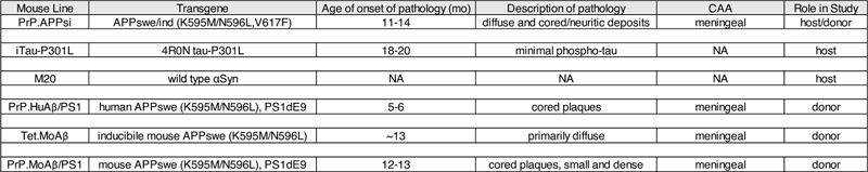 CAA, Cerebral amyloid angiopathy; NA, not applicable. The M20 mice express wild type αSyn under the control of the prion promoter and do not develop αSyn pathology (41). PrP.HuAβ/PS1 mice express human APPswe and human PS1dE9. PrP.MoAβ/PS1 mice express mouse APPswe mutation and human PS1dE9, and tet.MoAβ mice expresses inducible mouse APPswe (37). These mice were bred in-house. PrP.APPsi and M20 were maintained on hybrid C57BL6/C3H backgrounds, following a breeding scheme in which transgene-positive males were bred to nontransgenic F1 B6/C3 female mice. The iTau-P301L mice we used had been backcrossed to the FVB/NCr mouse strain for more than 10 generations. APPsi/Tau-P301L and APPsi/αSyn mice were generated by intercrossing mice that where hemizygous for the respective transgenes. PrP.APPsi mice were genotyped by visualizing GFP expression, which is possible because these mice were co-injected with a transgene that expresses GFP in the skin integrated next to APP transgene. PrP.APPsi/iTau-P301L mice were genotyped for APP by illumination and visualization with special filter goggles (BLS Ltd, Budapest, Hungary) and for tau by PCR of tail DNA. iTau-P301L and M20 mice were genotyped by PCR of tail DNA. PrP.APPsi mice destined for behavioral studies were backcrossed one generation onto C57BL6. All animals were housed 1-5 per cage with unlimited access to food and water with a 14-hour light and 10-hour dark cycle. All experiments involving mice were approved by the University of Florida Institutional Animal Care and Use Committee (IACUC) and conducted in accordance with NIH guidelines. Human brain lysates Human and mouse brain lysates were prepared as previously described (42). Briefly, frozen tissue was homogenized at 10% (w/v) in sterile PBS, subjected to vortex and sonication (3 x 5 sec) and then centrifuged 3000 x g for 5 min at 4°C. Lysates were immediately aliquoted and stored at -80°C until needed. As previously described (25), the Aβ levels and solubility in the lysates was assessed by Western blotting. Briefly, lysates were heated at 50°C for three minutes in the presence of denaturing sample buffer, were separated on a 4-12% Bis-Tris gel (Bio-Rad, Hercules, CA) in 1X2-(N-morpholino)ethanesulfonic acid (MES) running buffer (Bio-Rad, Hercules, CA) and transferred onto nitrocellulose membrane (Bio-Rad, Hercules, CA). The membrane was boiled in PBS for 5 min, blocked in Starting Block (Thermo Fisher Scientific [formerly Thermo Scientific], Waltham, MA) and incubated overnight at 4°C with primary antibody Ab5 (human Aβ1-16 specific; T.E. Golde) before incubation with the secondary antibody, fluorophore conjugated Alexa Fluor 680 anti-mouse IgG (Thermo Fisher Scientific, Waltham, MA). Protein bands were detected using the multiplex Odyssey Infrared Imaging system (Bio-Rad, Hercules, CA). Brain seeding with neonatal cerebral ventricle injections Injections of human brain lysates and lysates from a 27mo PrP.APPsi mouse, a 25mo PrP.HuAβ/PS1 mouse, a 24mo Tet.MoAβ mouse, and a 24mo PrP.MoAβ/PS1 mouse were performed as described previously with recombinant adeno-associated virus (43). Briefly, P0 pups were cryoanesthetized and 2 uL of human or mouse brain lysates were bilaterally injected into the cerebral ventricle using a 10 uL Hamilton syringe with a 30-inch needle (Hamilton Company, Reno, NV). Pups were placed on a heating pad for recovery and returned to their home cage. Cohorts of mice were euthanized at 6, 9, 12, and 18 months for analysis. Both male and female mice were analyzed (see Tables S1 and S2 for description of cohorts). Mouse brain tissue collection Mice were anesthetized with isoflurane and perfused transcardially with 20 mL of cold PBS. The brains were cut sagittally through the midline, and one hemibrain was drop-fixed in 4% paraformaldehyde in PBS (pH 7.5) for ~48 hrs at 4°C followed by processing and paraffin embedding. The other hemibrain was snap frozen with isopentane on dry-ice and then stored at -80⁰C until it was thawed and homogenized in preparation for ELISA measurements of Aβ peptide levels. Histology and immunochemistry Paraffin sections (5 μm) were used for all the histology and immunochemistry studies. Campbell-Switzer silver (44) and Thio-S (37) tissue staining methods were performed as previously described. Immunochemistry followed standard protocols described previously (37). To assess amyloid pathology, embedded sections were immunohistochemically stained with a biotinylated pan-Aβ antibody Ab5 (1:500; T.E.G.) and developed using Vectastain Elite ABC Kit (Vector Laboratories, Burlingame, CA) followed with 3,3’-diaminobenzidine (DAB) substrate (Vector Laboratories, Burlingame, CA). To evaluate tau pathology, embedded sections were immunohistochemically stained with 7F2 (1:10,000; Ben Giasson (39)), CP27 (1:1000; Peter Davies), AT8 (1:1000; ThermoFisher Scientific), and MC1 (1:1000; Peter Davies). To assess αSyn pathology, sections were stained with 9C10 (1:1000; Ben Giasson) (31). After development by 3,3’-diaminobenzidine (DAB) (Vector Laboratories, Burlingame, CA) substrate and counterstaining with hematoxylin, the slides were coverslipped and images were taken using an Olympus BX60 microscope or scanned by Aperio® XT System (Leica Biosystems, Buffalo Gove, IL, USA) or Zeiss microscope (Carl Zeiss, Oberkochen, Germany) and analyzed using the Zen 2.6 program (Carl Zeiss, Oberkochen, Germany). Blinded observers then reviewed the images and scored the burden of Aβ pathology based on the following criteria: “+++” = heavy Aβ burden with too many deposits to count. “++” = abundant pathology with >30 deposits per section. “+” = consistent pathology with > 5 deposits per section. “+/-” = inconsistent pathology with <3 deposits per section. Brain amyloid extraction Human brain samples were originally analyzed by Moore (25). Briefly, frozen pre-frontal cortex tissue was cryo-pulverized in liquid nitrogen and then seque