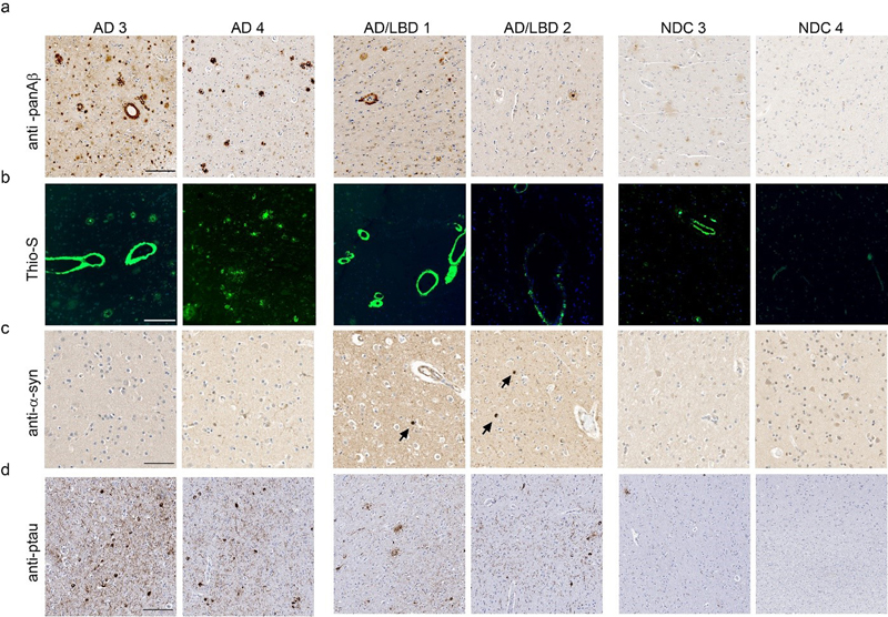 Fig. 3 Characterization of AD, AD/LBD, and control cases. Representative image from the cortex of 2 AD cases, 2 AD/LBD cases, and 2 NDC cases stained with (a) biotinylated anti-Aβ mAb 33.1.1 (anti-Aβ 1-16). Scale bar: 100 μm, (b) Thio-S. Scale bar: 50 μm, (c) anti-αSyn mAb 9C10 (anti αSyn 2-21). Arrowheads depict Lewy bodies. Scale bar: 100 μm, and anti-ptau mAb 7F2 (pThr205). Scale bar: 150 μm. PrP.APPsi/M20 and PrP.APPsi mice injected with AD brains developed widespread, robust Aβ pathology by 12 months post-injection (Fig. 4a and b). Aβ deposition was primarily diffuse and Thio-S negative (Fig. S10). There was no difference in Aβ seeding capacity between PrP.APPsi/M20 and PrP.APPsi mice. Interestingly, AD/LBD 1 and 2 also promoted deposition of Aβ in mice expressing APPsi with and without αSyn (Fig. 4), indicating that the AD/LBD brains contained considerable levels of Aβ seeds despite a much lower burden of Aβ pathology (Fig. 3). None of the injected animals developed appreciable αSyn pathology (data not shown). Although two of the donor cases contained significant CAA pathology, CAA was not seeded in the recipient mice (Fig. S10).