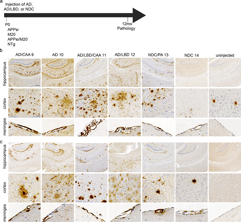 Fig. 4 Cerebral injection of AD and AD/LBD brain lysates results in widespread amyloid deposition and CAA. Overall schematic of the experiment (a). Newborn P0 mice were injected with AD, AD/LBD, and NDC brain lysates and aged 12 months. Representative brain sections (hippocampus, cortex, and meninges) of (b) PrP.APPsi/Line M20 and (c) PrP.APPsi mice stained with biotinylated anti-Aβ mAb Ab5 (anti-Aβ 1-16) and counterstained with hematoxylin. n=4-8. Scale bar: hippocampus: 250 μm, cortex and meninges: 50 μm. Seeding diffuse Aβ deposition does not impair performance in a fear-conditioning cognitive task To assess whether the diffuse Aβ pathology seeded by AD brain produces cognitive deficits, an additional cohort of PrP.APPsi mice were seeded with AD 1 and 2, or NDC 1, and then were aged 12 months before behavioral testing in a fear-conditioning paradigm. Control groups were mice that were not injected with brain lysate and nontransgenic littermate mice that were either injected with the same lysates or uninjected. The performance of the animals in the contextual fear memory test was conducted twice. In the first round of testing, the performance of the seeded mice was not statistically different from that of the control uninjected mice (Fig. 5a). Overall, in this first round of testing, the percentage of time animals that exhibited freezing behavior was relatively low. In the second round of testing, we expected to reinforce memory of the adverse cue (context or tone) and we observed that re-tested mice showed increased levels of freezing behavior (Fig. 5b); however, there was still no statistically significant difference in the performance of the seeded mice relative to any control. These findings indicate that the diffuse Aβ pathology seeded by these homogenates of human AD brain does not produce a meaningful impairment in the systems involved in fear-conditioning memory tasks.