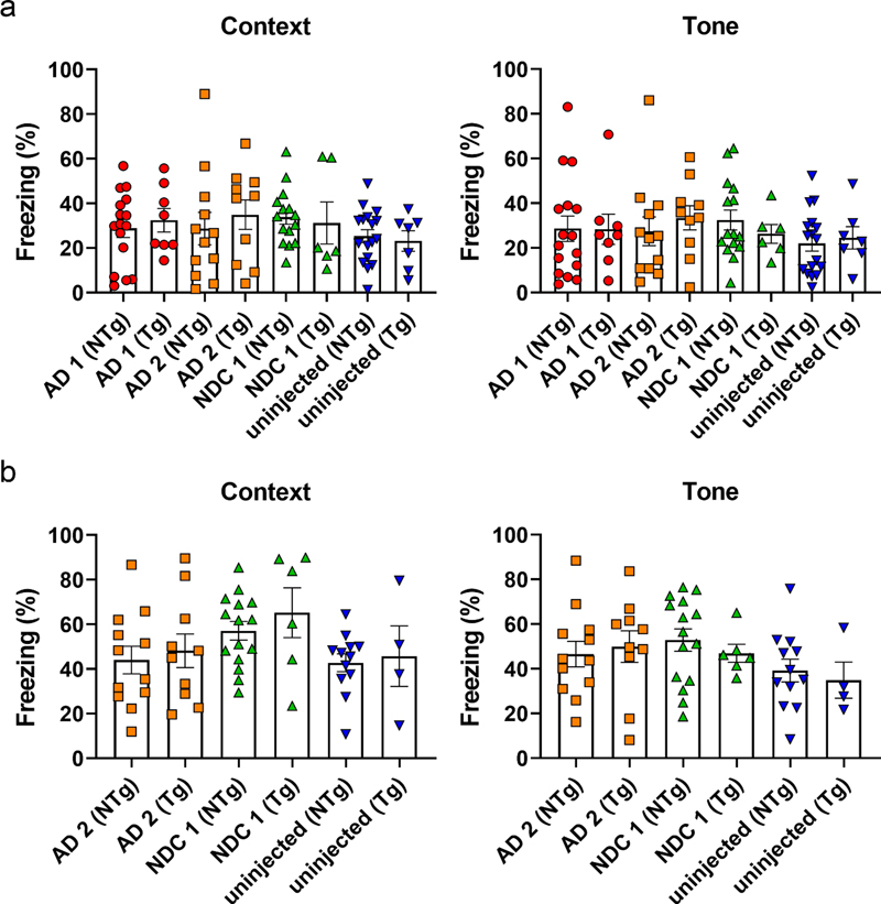 Fig. 5 Diffuse amyloid seeding does not cause cognitive impairment in fear-conditioning. PrP.APPsi mice seeded by AD and NDC lysates, were aged 12 months and subjected to contextual fear conditioning. Mean percentage freezing ± standard error of the mean exhibited by PrP.APPsi and nontransgenic (NTg) littermates injected with AD cases 1 or 2 and NDC case 7. Uninjected mice were the control group. (a) Context and tone paradigm. (b) A subset of mice were re-tested the following week, context and tone test. n = 6-8/Tg, n = 12-16/NTg mice per group. Assessment of Aβ seeding efficiency in APPsi mice To examine the relative seeding efficiency of different types of Aβ pathology in PrP.APPsi mice, we used an approach in which homogenates from the brains of 4 different lines of aged APP and APP/PS1 mice were used to seed accelerated Aβ deposition (described in Table 2). At these advanced ages, each of the mice used to produce inoculum had substantial Aβ pathology (Fig. S11). Following the strategy used above, we injected the homogenates containing Aβ seeds into newborn mice on neonatal day 0, which were then aged to 9, 12, or 15 months before euthanasia and neuropathological analysis by Campbell Switzer silver stain and Thio-S staining. The type of pathology noted and the relative abundance score are noted at the bottom of each column of images in Figure 6. In all of the PrP.APPsi mice injected with brain homogenate seeds from mice that primarily exhibited cored plaques, we observed an obvious shift in the type of Aβ deposits in recipient mice to match the pathology found in the donor mice used for seeding (Fig. 6). Self-seeding of newborn PrP.APPsi mice with brain homogenates from aged PrP.APPsi mice produced diffuse deposits (Fig. 6), which was the predominant form of Aβ pathology in the PrP.APPsi animal used to generate the seeding homogenate (Fig. S11). Similarly, the predominant pathology in the ~25 month old Tet.MoAβ animal used to prepare seeding homogenate was diffuse Aβ deposits (Fig. S11)(48), and brain homogenates from this animal efficiently seeded the deposition of human Aβ in the PrP.APPsi mice to produce diffuse deposits (Fig. 6). PrP.APPsi mice seeded with homogenates from donors that had primarily cored deposits had lower Aβ burden scores, but importantly we observed a shift in the neuropathologic features of the recipient mice to a much higher incidence of cored deposits (Fig. 6). Interestingly, the morphology of deposits in the seeded PrP.APPsi mice was not quite identical to the source PrP.HuAβ/PS1 mice in that the seeded deposits were smaller and appeared to be more compact than the donor line. These small dense deposits were Thio-S positive (Fig. 6). Similar small dense core deposits that were Thio-S positive were observed in the cortex of PrP.APPsi mice injected with brain homogenates from the PrP.MoAβ/PS1 mice (Fig. 6). Collectively, these findings demonstrate the relative ease with which diffuse Aβ pathology can be induced in PrP.APPsi mice.