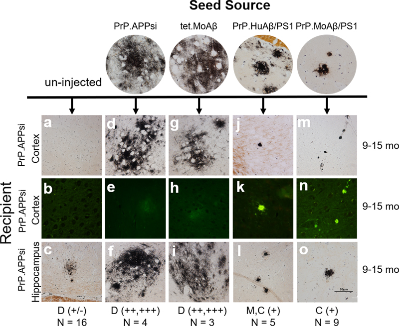 Fig. 6 Comparison of seeding activity between transgenic mice that exhibit diffuse versus cored Aβ pathology. We selected brains from four sources that exhibit either diffuse or cored neuritic Aβ deposits (see Fig. S11). Newborn PrP.APPsi mice were injected with homogenate from each of the four sources identified at the top of the figure. Compared to uninjected mice, PrP.APPsi mice injected with brain homogenates from any source showed an induction of Aβ pathology. Inoculum from aged PrP.APPsi and tet.MoAβ mice, which primarily exhibit diffuse Aβ pathology (37, 48), robustly seeded diffuse pathology in the injected PrP.APPsi mice (severity of pathology and number of animals indicated at the bottom of the figure). Inoculum from aged PrP.HuAβ/PS1 (a.k.a. APPswe/PS1dE9) and PrP.MoAβ/PS1 mice, which primarily exhibit cored neuritic deposits (37, 48), induced the deposition of a limited number of cored Aβ deposits in injected PrP.APPsi mice with little or no diffuse deposits. D = diffuse Aβ pathology. M = mixed diffuse and cored deposits. C = cored, neuritic deposits. Discussion We investigated whether injection of neonatal APP, APP/tau, or APP/αSyn mice with AD or AD/LBD brain homogenates could be used as a paradigm to generate mice that model the mixed pathology associated with each disease. Despite the widespread induction of diffuse Aβ deposition by injection of four different AD brain lysates, and the presence of tau seeds in these lysates, tau pathology was not induced. For comparison, we also injected PA brain lysates, finding a similar induction of diffuse Aβ deposition without induction of tau pathology. Similarly, injection of AD/LBD brain lysates induced diffuse Aβ deposition, but αSyn pathology was not induced. In all cases, the induced Aβ pathology exhibited a diffuse, Thio-S negative, morphology. PrP.APPsi mice injected with AD brain lysates that develop diffuse Aβ pathology showed no significant impairment in a fear-conditioning cognitive task. Our findings suggest that seeding the brains of neonatal transgenic mice with AD, AD/LBD, and PA brain homogenates can efficiently induce diffuse Aβ deposition but neither AD nor AD/LBD brains seeded concurrent tau or αSyn pathology. The most common route of administering Aβ seeding preparations is by stereotaxic injection into the hippocampus of adult APP transgenic mice (reviewed in (13)). In host mice that develop amyloid pathology at relatively young ages, the induced pathology created by seeding may be localized to the site of injection and overlying cortex (13); whereas, in models that do not develop deposits until late in life, the induced pathology may be more wide-spread (reviewed in (13)). The PrP.APPsi host we used in the present study develops pathology on its own between 12-14 months of age. In testing the approach of injecting Aβ seeds into newborn mice from this model, we aspired to attain a widespread distribution of seeding material and induce Aβ, tau, or αSyn pathology throughout the brain. This approach replicates previous studies where P0 injection of adeno-associated virus resulted in widespread distribution in the brain (49). Injection of newborn hamsters with scrapie prions has been shown to accelerate onset of prion disease (50). Additionally, we have observed that intracerebral injection of newborn A53T αSyn mice with brain lysates from multiple system atrophy donors induces αSyn pathology and motor impairment (31), and that intraspinal injection of newborn mice expressing mutant superoxide dismutase (SOD1) can accelerate the onset of paralysis and pathology (51, 52). Thus, in performing newborn injections our goal was to initiate pathological cascades as early as possible in order to determine whether there may be distinct synergies between Aβ and tau, or Aβ and αSyn, which can be elaborated by seeding. We recognize that there are a large number of potential mouse models that could have been used for these studies. The APP mouse model we used for these studies was selected because PrP.APPsi mice do not inherently develop Aβ pathology until 12-14 months of age and because this model can exhibit a full spectrum of Aβ pathology including cored-neuritic, diffuse, and vascular deposition (see Supplemental Fig. S2). The tau model we chose to use expresses human P301L tau at relatively low levels and does not develop tau pathology on its own. When paired with mice that express the tetracycline transactivator in the rTg4510 model these develop a robust tau pathology (38). In paradigms in which tau expression in rTg4510 mice is induced early and then suppressed by doxycycline, the low level of “leaky” tau expression in this model is sufficient to sustain neurofibrillary tangle pathology (38). In our paradigm, we asked whether neonatal seeding of this tau model could induce a sustained pathology in the same way that early expression of the transgene at high levels produced sustained pathology. Alternatively, we were interested to determine whether we could detect any synergy between concurrent Aβ pathology and tau seeding. The αSyn model we chose to use expresses human WT αSyn at levels that do not cause pathology (41). WT αSyn (M20) mice can be seeded when injected with high levels of purified αSyn fibrils, but are not easily seeded by human brain homogenates (31). Our goal in choosing the M20 WT αSyn mice was to develop a model of human αSyn pathology and assess whether concurrent Aβ pathology could synergize αSyn seeding. Our method of seed preparation followed commonly used protocols where we injected a soluble fraction; frontal cortex homogenized in PBS (10% w/v) followed by sonication and low speed centrifugation, as previously described (42, 53, 54). By this method, we expected sonication to fragment all types of seeds with a mixture of seeds remaining in suspension after low-speed centrifugation. As we have observed here, the most common outcome of Aβ seeding with similar