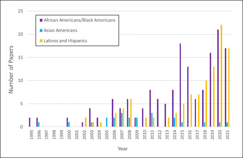 Figure 1. Number of papers found on PubMed as of November 19, 2021 by year using the search terms “Alzheimer’s brain pathology” along with the demographic term (categories in legend, see supplemental section for further information). While there has been advances in neuropathology literature focused on Latinos/Hispanics and Black Americans in recent years compared to other minority groups, there are still limited participants in these cohorts. The existing literature is limited in sample size, which varies widely between studies and typically with the minority groups representing a small fraction of the cohort (see Tables 1 and 2). Furthermore, studies can have certain inclusion and exclusion criteria that may hinder participation in select groups; for example, exclusion of CVD for AD studies may decrease frequencies of certain minority groups with higher frequencies of CVD50. These constraints from low minority group recruitment may be due to numerous factors, including lack of access to healthcare, historical abuses of minority groups for medical research, mistrust of the healthcare system making participants less likely to agree to participate in clinical trials or autopsy programs, and language barriers5, 8, 10, 11, 30, 31, 37, 49, 75, 100. With respect to retention, a systematic review highlights a lack of literature that examines retention exclusively from recruitment39. Socioeconomic circumstance was shown to be the most powerful contributor to the absence of participants for longitudinal studies involving ethnoracial minorities26. Low socioeconomic status largely impacts access to health care resources such as regular visits to a health professional as a result of being uninsured10, 87, 88, in which patients may not only lack the direct care they need but also the general awareness of clinical study enrollment opportunities. Flexible scheduling played a substantial role in participation as many individuals were restrained by work or childcare obligations for their appointments as well as transportation26, 32, 69. Financial compensation was a major influencer in recruitment amongst ethnoracial minorities51, 69; it has been reported that members of the Latino/Hispanic community were motivated by monetary compensation for their time because they experienced economic hardships69. Patients may also feel discrimination in the process of seeking care, especially among non-Whites for their race, color, and/or ethnicity35. Half of Black Americans report they have faced healthcare discrimination, and one third of Asian Americans and Latino Americans similarly report having experienced healthcare discrimination as well35. A vast majority of non-White Americans believe that in the importance of having AD and dementia care providers to understand their ethnic/racial backgrounds, such as Native Americans, Black Americans, Latinos/Hispanics, and Asian Americans35. However, less than half of Black and Native Americans are confident there are culturally competent providers, and only roughly 3 in 5 Asian Americans and Latinos/Hispanics are confident35. A few studies have attempted to understand barriers and willingness for brain donation across major US racial ethnic groups: NHWs, Latinos/Hispanics, Black Americans, and Asian Americans11, 12. While conducting focus groups, the first study revealed concerns, attitudes and beliefs around brain donation that fell into three categories: 1) religious beliefs 2) concerns and misconceptions about brain research and 3) the role of the family7. A follow up study surveying NHWs as well as 169 African Americans, 50 Asians, and 61 Hispanics revealed older age, Latino ethnicity and understanding of brain use by researchers and what participants need to do to ensure brain is donated were positive predictive factors, while the belief that the body should remain whole at burial, African/African American race, and concern researchers might not be respectful of the body during autopsy were negative predictive factors11, 12. The belief that the body should remain whole was shared amongst Latinos/Hispanics, African Americans, and Asian Americans, which was a similar sentiment of Alaskan Natives and American Indians mentioned earlier52. This further illustrates the substantial role cultural barriers may play in cohort participation from US minority groups. Knowledge, stigma, and apprehension of ADRD also differ across ethnic/racial groups. For example, one study revealed that NHWs tended to have greater knowledge about AD compared to Black Americans, and Black Americans had same or greater levels of concern about getting AD as NHWs depending on their geographic location47. Another study discovered concern about developing ADRD in Native Americans, Black Americans, and Latinos/Hispanics is noticeably lower compared to NHWs35, which contradicts the finding about Black Americans in the aforementioned study, possibly due to region differences where the data was taken. It has also been shown that Asian Americans do not exhibit a strong concern of ADRD as many believed it was a natural occurrence for aging people14. Multiple papers have denoted that Asian Americans had beliefs of stigma of persons with AD, which played a significant role in seeking care from primary care providers for AD14, 19, 60. Limited knowledge on not only ADRD but also the brain removal process poses some hesitance on minority subject participation8, 11. As stated above, some themes that subjects or family members of subjects shared skepticism on were understanding the purpose of studying a decedent’s brain, misconceptions on how the brain is used or collected for research, and overall knowledge about the brain donation procedure11. It is important to recognize the existing inadequacies and confines of the study recruitment process for US minority groups to further advance the representation of these populations in biomedical research. Fortunately, there has been progress to minimize these bar