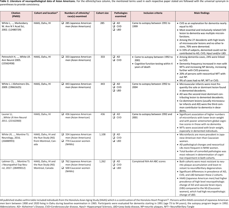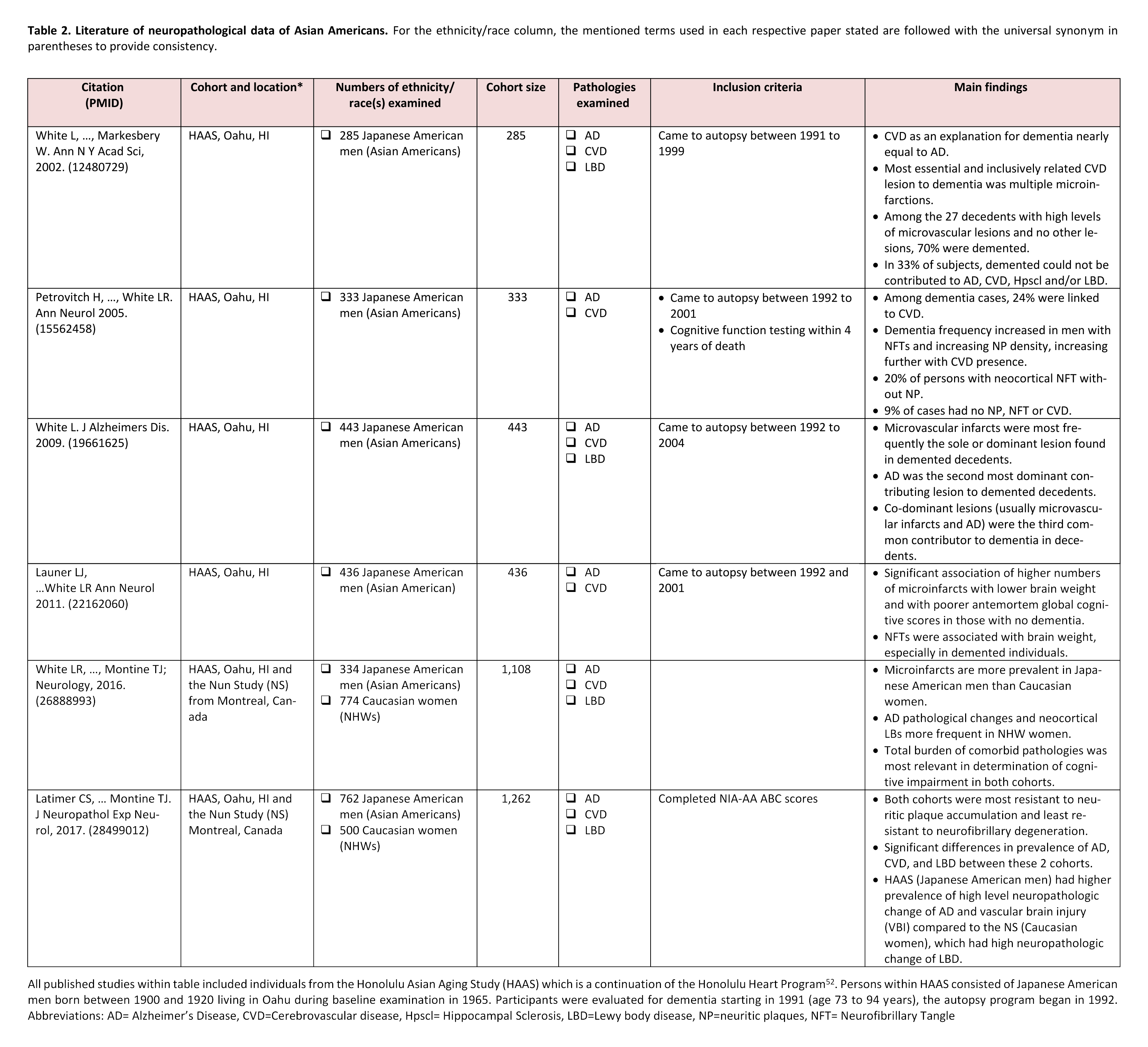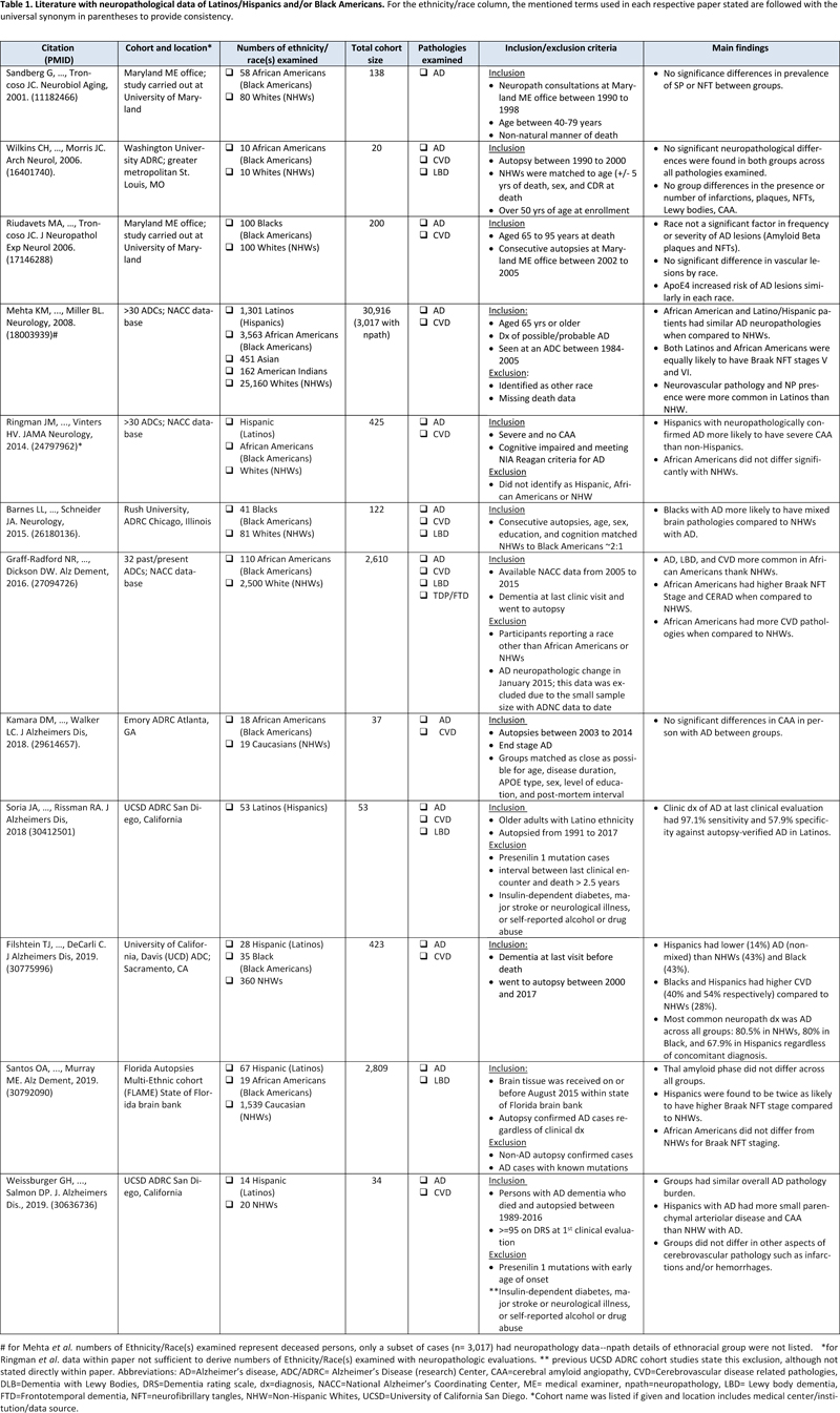 Abstract Alzheimer’s disease (AD) and vascular dementia are two of the most prevalent dementias that afflict the aging population in the United States (US). Studies have made great strides in understanding the neuropathology of these diseases; however, many studies are conducted in the context of non-Hispanic whites (NHWs), and few include the rapidly growing underrepresented populations that reside in the US. We sought to characterize current knowledge of the neuropathologic landscape of AD and vascular dementia of the largest growing US minority groups, namely Latinos/Hispanics, Black Americans, and Asian Americans, compared with NHWs being the majority group. It is vital to note these historic categories are social constructs and cultural and social associations may underlie differences. We conducted a literature search utilizing specific criteria to yield neuropathology papers that addressed the demographics and neuropathologies of relevance, then collated the findings into this review. We reveal that while there has been much progress in neuropathological research involving Latinos/Hispanics and Black Americans in the past decade, no cohesive conclusions could be extrapolated from the existing data due to the dearth of minority participants and even smaller amount of information related to the heterogeneity within each minority group, especially Latinos/Hispanics. Furthermore, we reveal an even greater scarcity in neuropathological studies involving Asian Americans, also a very heterogeneous group. We hope the presented findings will illuminate the paucity of minority representation in not just neuropathological research but the field of clinical research overall and serve to inspire clinicians and researchers to help reduce the health disparities underrepresented groups in the US face. Introduction Clinically, Alzheimer’s disease (AD) is defined as a type of dementia distinguished by neurodegeneration that results in memory loss and deterioration of cognitive functions24, 38. Neuropathologically, AD is defined by aggregations of the amyloid-β (Aβ) protein, in the form of Aβ plaques, and tau protein, in the form of neurofibrillary tangles (NFTs)13, 25, 97. In addition to Aβ plaques and NFTs, neuropathologies associated with vascular dementia can also be concomitant57, 78, 101. Vascular dementia is the second most common cause of dementia following AD and neuropathologically can manifest as infarcts and hemorrhages as well as other vascular pathologies such as cerebral amyloid angiopathy (CAA) and arteriolosclerosis9, 17, 23, 63, 90, 101. While there has been progress with understanding disease phenotype (for review see 89) and progress with therapies having evidence of targeting and reducing Aβ plaques in the brain, there have yet to be treatments that fully cure or stop the progression of the disease20, 22. Although great strides have been made to combat this disease, most studies have focused on select populations or cohorts, specifically composed of persons identifying as non-Hispanic whites (NHWs)28, 43, 73, 97. The population of persons age 65 and over in the United States (US) has significantly increased in the past decade—as much as a 36% increase2. US ethnoracial minorities made up 20% of this age demographic at the beginning of the decade, and increased to 24% by the end of it2. The NHW population of age 65 and over is projected to increase 29% by 2040 in comparison to the 115% increase of the ethnoracial minority population2. The largest US minority population is Latinos/Hispanics, followed by Black Americans, then Asian Americans, which are the fastest growing demographic18, 53. Other notable underrepresented groups are American Indians (Native Americans), Native Hawaiians, and Pacific Islanders4. It is important to note in this paper we will utilize historic terms (such as those within the US census) and these categories are social constructs and cultural and social associations may underlie differences. Diversity in studies maximizes variability in risk and protective factors. This can aid in studying clinically relevant transitions across the spectrum of a disease with the goal of identifying modifiable pathways to support maintenance of normal functions. As racial/ethnic groups in the US continue to grow in addition to longer life expectancies, more diverse elderly individuals will be seen for diagnosis and treatment of neurodegenerative diseases; thus, more research reflecting the population diversity is needed so that prevention, treatment, and prognosis strategies encompass all who are affected by the devastating impact of dementia. Heterogeneity of race and ethnic categories Race and ethnicity are two terms fundamentally distinct from one another. Race historically has been used to describe the physical traits of an individual such as their eyes, hair, and skin, whereas ethnicity has been used to describe an individual’s cultural identity74. It is essential to remember these terms are socially constructed and hold no bearing on an individual’s biology. The categorizations for race and ethnicity in the US have evolved over time as self-identification shifts, immigration, and mixed racial heritage became more prevalent1.The term “race” has regretfully implied a sole focus on an individual’s morphology, and historically has not accounted for other background variables such as geographic origin, environmental factors, and sociocultural characteristics that influence these differences43, 98. While the historic terms employed in this review are not optimal given how restrictive and tentative they are, the U.S. Census uses them, which many neuropathology studies have utilized as well, and thus are presented as such in this review. Thankfully, there is a growing awareness that these historic terms alone do not aptly stratify these individuals in a scientific context and new approaches are being encouraged1, 6, 43, 49. Furthermore, it is important to r