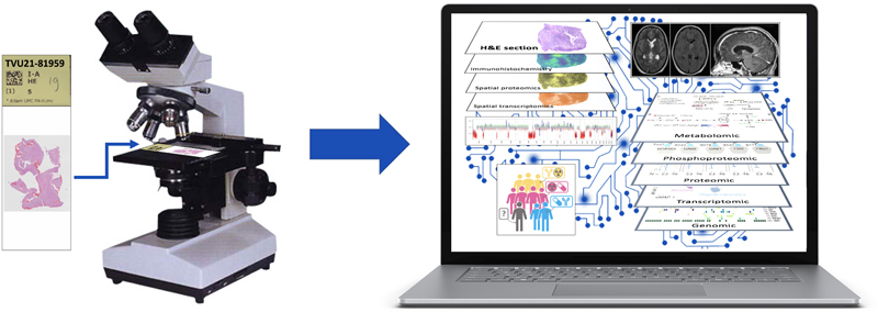 Figure 3. Neurooncological pathology: from thin slicing to augmented realityAs histological slides formed the basis for the diagnosis of (CNS) tumors for multiple decades, one can argue that for a long time clinical (neuro)pathologists have acted as masters of ‘thin slicing’. This term was initially used especially in psychology and philosophy for a situation in which one makes very quick inferences about the state, characteristics or details of an individual or situation with minimal amounts of information. In the context of tumor pathology, it could literally mean the ability to make quick inferences about characteristics of a tumor using very thin slices of tissue. Nowadays, however, for an increasing number of CNS tumors, molecular characterization is necessary as well. In the near future, spatial and/or multi-omics analysis of CNS tumors may be required for an optimal assessment of the diagnosis (including prognosis) and for prediction of the best therapeutic management. One can expect that by that time, diagnostic (AI-guided and visual) support tools have become available that guide the neurooncological pathologist from a more bounded rationality into an augmented reality. Meanwhile, it is important to realize that the judgement of an experienced (neuro)pathologist based on thin-slicing/histological slides will remain invaluable for an optimal diagnosis and indeed in quite some situations (e.g., tumors that can readily be recognized based on an H&E stained section +/- some additional immunohistochemical stains, and in case of problems with representativeness or a differential diagnosis with non-neoplastic lesions) can even be more accurate than judgements based on much more, non-histological information. References