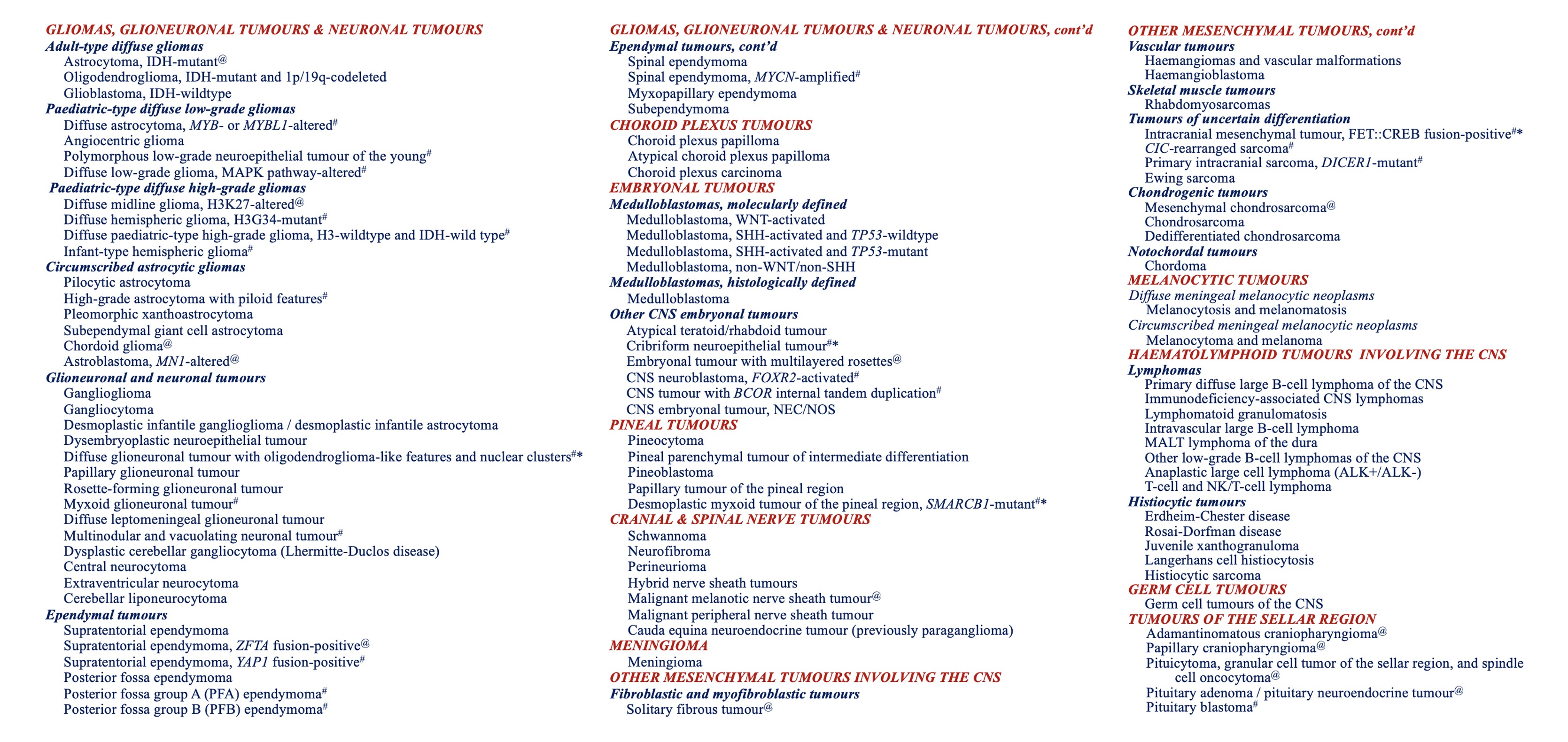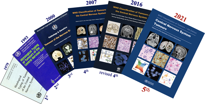 Figure 1. Covers of the WHO CNS tumor Blue Books throughout the years.In these Blue Books, the actual WHO CNS tumor classification is the list of tumors that are recognized as distinct tumor types (see e.g. Table 1 for the 5th edition); the rest of the information in these books concerns explanation of the pathological (nowadays histological and molecular) characteristics of these tumors, and the most salient information on their clinical and radiological context. Molecular characteristics were for the first time introduced as defining criteria in the revised 4th edition, especially for diffuse gliomas in adults and for some embryonal tumors. In the 5th edition, molecular features are introduced as essential diagnostic criteria for many more tumors. In line with recommendations of the cIMPACT-NOW consortium 15, salient changes in this new classification are the separation of (groups of) pediatric-type low-grade and pediatric-type high-grade diffuse gliomas from adult-type diffuse gliomas, further refinement of the classification of ependymal tumors, and the addition of a few newly recognized tumors in the category of CNS embryonal tumors. Table 1 provides an overview of these changes in the WHO CNS5 classification (with # and * indicating the newly introduced and the provisionally accepted tumor types, respectively). Another important change is that grading of neoplasms is performed in the WHO CNS5 classification within (rather than across) tumor types, with Arabic (instead of Roman) numerals now used for the different grades. Thus, in the WHO CNS5 classification there is only one entry for e.g. astrocytoma, IDH-mutant, and one for meningioma (rather than separate entries for e.g. anaplastic astrocytoma, IDH-mutant, or for atypical meningioma). Also, glioblastoma, IDH-mutant should now be diagnosed as astrocytoma, IDH-mutant, CNS WHO grade 4. Table 1. WHO classification of primary CNS tumors, 5th edition (2021).Major changes in the WHO CNS5 classification are the separation of (low-grade and high-grade) pediatric-type diffuse gliomas from adult-type diffuse gliomas; the recognition of several new ependymal, embryonal and other tumor types; assigning of CNS WHO grades within tumor types; coining the most malignant IDH-mutant diffuse astrocytic tumor as astrocytoma, IDH-mutant, CNS WHO grade 4; and changing the name of diffuse midline glioma (DMG), H3 K27M-mutant into DMG, H3K27-altered. See summary of Louis DN et al. 1 or, even better, the (digital version of the) ‘Blue Book’ for much more information of these changes. In RED & CAPITALS & ITALICS: overarching categories of tumors; in Bold and italics: groups of tumor types, and under these groups (with a few exceptions) the individual tumor types; # = newly defined tumor type compared to the 2016 edition; * = provisional tumor type; @ = tumor with revised nomenclature or revised placement. Click here to view a large version of this table. Furthermore, the presence of TERT promoter mutation, EGFR amplification and/or the combination of gain of complete chromosome 7 and loss of complete chromosome 10 can now be used for diagnosing an adult-type, histologically lower grade, IDH-wildtype diffuse glioma as glioblastoma, IDH-wildtype (CNS WHO grade 4), and the presence of homozygous CDKN2A/B loss to diagnose a histologically lower grade, IDH-mutant diffuse astrocytoma as CNS WHO grade 4. For yet other tumors the name or their placement in the classification was changed as well (@ in Table 1). For example, H3K27M-mutant after diffuse midline glioma (DMG) was changed into H3K27-altered because there are H3-wildtype DMGs especially in children that do show loss of nuclear H3K27me3 staining and with a similar prognosis as DMGs, H3K27M-mutant. Also, the name RELA fusion-positive for a subset of supratentorial ependymoma was changed into ZFTA fusion-positive, as ZFTA (‘zinc finger translocation associated’, the new name for c11orf95) appears to be the more frequent fusion partner in these tumors (most frequently showing fusion with RELA). Compared to the revised fourth edition, the WHO CNS5 tumor classification certainly is an improvement. However, as discussed in somewhat more detail in the last part of this review, this new classification brings several challenges as well, e.g., related to the (lack of) availability of molecular diagnostic tools, finding the optimal therapeutic management for newly defined tumor types, and the fact that a more refined taxonomy of CNS tumors makes it more difficult to perform studies on a large number of patients. Topic 2: Glioma driver mutations in the normal human brain 2 Cancer is a disease characterized by the accumulation of genomic aberrations that confer a proliferative advantage. Also, somatic mutations and copy number variations have been described to accrue with age in (seemingly) normal tissues 16. However, relatively little is known about this phenomenon in the normal brain. Ganz J and Maury EA et al. (with Lee EA and Walsh CA as corresponding authors) published a paper in Cancer Discovery 2 in which they used targeted gene sequencing on cerebral gray and white matter samples of 110 individuals to investigate the presence of oncogenic variants in normal brain tissue. The 121-gene panel was selected for genes implicated in different diseases and previously characterized oncogenic drivers. The authors hypothesized that somatic mutations would accumulate in brain tissue over time and (as neurons have a low proliferation capacity) would be enriched in cerebral white matter. The authors identified 35 variants present in normal brain tissue: 12 of the variants were in known proto-oncogenes or tumor suppressor genes, and 6 were known driver mutations of gliomas (IDH1, PTPN11, PTEN, NF1, APC, MTOR). The authors validated the variant allele frequencies (VAFs) from their gene panel with ultra-deep Ion Torrent sequencing. The most frequently found mutation was IDH1 R132H. In one patient, two adjacent white 