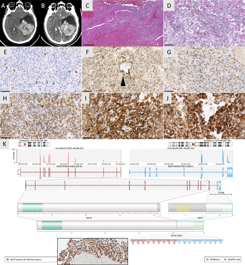 Introduction Synovial sarcoma (SS) is an aggressive soft tissue sarcoma that occurs primarily in the juxta-articular extremital regions of young adults, followed by the trunk and the head and neck. They are universally defined by a fusion of SS18 with one of the SSX genes (predominantly SSX1). Primary SS of the central nervous system (CNS) have been rarely reported in the literature (n=22 molecularly confirmed cases) and have not yet been added to the mesenchymal non-meningothelial chapter of the World Health Organization (WHO) classification of CNS tumors. Here, we report one case of SS18-rearranged CNS-SS, with a review of the literature to determine its clinical, radiological, and histopathological features and its main differential diagnoses. Case presentation A 62-year-old woman presented with an intraventricular hemorrhage (Figure 1 A-B). The patient had a history of a hemorrhagic lesion diagnosed as a central neurocytoma and was treated by surgery 3 years earlier. The tumor exhibited histologically dense, solid, hemorrhagic, and basophilic cell proliferation (Figure 1C), composed of monotonous spindle cells, with round to oval nuclei lacking any pleomorphism or mitotic activity. The cytoplasm was scant or more abundant and vacuolated (Figure 1D). There was no collagenous stroma, myxoid changes, “hemangiopericytoma-like” vasculature, whorls, psammoma bodies, neurocytic rosettes, papillae, rhabdoid, or glandular formations. Necrosis and microvascular proliferation were absent, and the Ki67 labeling index was low (1%) (Figure 1E). Tumor cells were immunonegative for AE1/AE3, CK7, CK20, CK18, SSTR2A, EMA, CD34, STAT6, CD45, CD99, NUT, Olig2, GFAP, SOX10, PS100, HMB45, chromogranin A, synaptophysin, NeuN, neurofilament, desmin, and smooth muscle actin. The expression of H3K27me3 and BRG1 was retained. INI1 was maintained with a diminished expression in comparison to the endothelium (Figure 1F). The tumor expressed vimentin, CD56, Bcl2, TLE1, and BCOR (but with less intense staining compared to our control, a molecularly confirmed CNS tumor with internal tandem duplication of BCOR) (Figure 1G-J). Histopathological characteristics were like those of the previous surgical sample. The initial tumor was diagnosed as a neurocytoma due to its intraventricular location, its expression of CD56 and because of its absence of any sign of malignancy (particularly no mitosis). Initial and recent whole-body imaging did not show other tumor locations. Digital droplet PCR failed to reveal an internal tandem duplication of BCOR, and whole-exome RNA sequencing [1] demonstrated a SS18::SSX1 gene fusion (Figure 1K). An additional immunostaining targeting the chimeric protein SS18::SSX was secondarily performed and revealed a strong and diffuse expression in the primary tumor and its recurrence (Figure 1K). Using DNA-methylation analysis, the tumor was not classifiable by the Heidelberg Brain Tumor Classifier (v12.5) and the Sarcoma Classifier (v12.2). A final diagnosis of primary CNS-SS was suggested. Forty months after the initial diagnosis, the patient was alive without a tumor residue. Figure 1. Radiological, histological, and molecular features of the recurrent tumor. (A) Axial CT scan showing a voluminous left intraventricular mass with hemorrhage. (B) Axial CT scan after contrast injection showing a heterogeneous enhancement of the mass. (C) Densely cellular proliferation with hemorrhagic changes (HPS, magnification x100). (D) Monotonous basophilic spindle cells with round to oval nuclei and vacuolated cytoplasm (HPS, magnification x400). (E) Low Ki67 labeling index (magnification x400). (F) retained expression of INI1 with low intensity (magnification x400). (G) Diffuse but moderate immunoexpression of BCOR (magnification x400). (H) Diffuse immunoexpression of Vimentin (magnification x400). (I) Diffuse immunoexpression of CD56 (magnification x400). (J) Diffuse immunoexpression of Bcl2 (magnification x400). (K) Whole exome RNA-seq analysis highlights a fusion between SS18 (pink) and SSX1 (blue) genes, respectively located on chr.18 and chrX. Immunopositivity for the chimeric protein between SS18 and SSX with retained protein domain of SS18 detected by immunohistochemistry (insert magnification x400). Black scale bars represent 50 μm for figures D-J; and 250 μm for figure C. HPS: Hematoxylin Phloxin Saffron. Clicking the figure will lead you to a virtual slide (H&E). Discussion and conclusion Molecularly confirmed examples of primary CNS-SS are very rarely reported in the literature (n=22 cases, Table S1) [2–8]. Like their soft tissue counterpart, they affect young adults (median age 21 years with ranges from 1 to 81) or children (32% of cases) [2,3] with a male predominance (sex ratio male to female: 1.75) [2–8]. They are mainly supratentorial (19/22, 86% of cases) [2–8] and 9% of them are intraventricular as was the case for our patient [2]. Clinical symptoms depend on the location of the tumor, but interestingly, 4/22 cases (18%) are revealed by an intracerebral hematoma [2,5,8]. Radiologically, they present as a solid (13/22 cases) or cystic mass (8/22 cases) that is well defined from the parenchyma (11/16 cases) [2–4,8]. Some of them present a dural attachment (4/22 cases) [4–7]. Histopathologically, SS is classically divided into three subtypes within the soft tissue: biphasic (composed of a mixture of spindle cells and epithelial component), monophasic (only composed of spindle cells), and poorly differentiated (composed of round or spindle cells with a high mitotic index and pronounced atypia). Rare SS examples can exhibit a round cell morphology [9–11]. In the CNS, all these variants have been reported, the monophasic subtype (as our case) being the most frequent (10/21 cases compared to 9/21 biphasic and 2/21 poorly differentiated cases) [2,4–7]. Recently, a highly specific and sensitive antibody targeting the SS18::SSX fusion protein has been developed independently of t