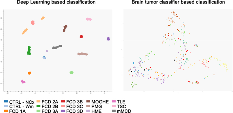 Figure 2: “One brain – many genomes” 17 Somatic variants are spontaneously acquired during neurodevelopment. All the somatic variants in a progenitor cell are passed down to its daughter cells. The number of cells carrying a specific variant is an indirect marker for the developmental time point at which it was generated. With permission from the author 8. Brain mosaicism, however, can only be detected in tissue obtained from autopsy or brain biopsy. Liquid biopsy using cell-free DNA derived from cerebrospinal fluid (CSF) could yet be another source for genetic testing, as successfully proven in malignant brain tumors. In 2021, Ye and coworker published a proof of principle study demonstrating that CSF liquid biopsy is valuable in investigating mosaic neurological disorders where brain tissue is unavailable18. First, they sequenced CSF cell-free DNA (cfDNA) in 28 patients with focal epilepsy and 28 controls (using droplet digital polymerase chain reaction (PCR)). They detected somatic mutations in three patients, i.e., the LIS1 p.Lys64* variant at 9.4% frequency in one patient with subcortical band heterotopia; the TSC1 p.Phe581His*6 variant at 7.8% frequency in another patient with FCD and thirdly the BRAF p.Val600Glu variant at 3.2% frequency in a patient with ganglioglioma. They also determined that cfDNA was brain-derived by using whole-genome bisulfite sequencing and demonstrating an enrichment of brain-specific DNA methylation patterns. In a second parallel study and publication, same results were obtained from CSF collected during epilepsy surgery19. Somatic variants were detected in cfDNA from 3 epileptic patients with known somatic mutations previously identified in brain tissue (out of 12 patients included in the study). Both proof-of-principle studies provide evidence that brain mosaicism can be detected in the CSF-derived cfDNA and open future avenues for detecting the mutant allele driving epilepsy in CSF. TOPIC 3: DNA-methylation classifier for malformations of cortical development The histopathological work-up of epilepsy surgery specimens is often based only on routine hematoxylin and eosin (H&E) staining with its many difficulties and pitfalls in reliable identification of anatomical landmarks and cortical layering. This applies particularly to samples not resected anatomically en bloc, or when compromised by peri-operative artefacts or diagnostic procedures such as intracranial electroencephalography (EEG) recordings, laser ablation or thermo-coagulation. It has been a long-standing effort in histopathology, therefore, to support the microscopic diagnoses with objectifiable diagnostic measures. Indeed, the same issue applied to the scenario in neuro-oncology before the discovery and introduction of predictive and prognostic genetic markers for the differential diagnosis of high-grade glioma and embryonal brain tumors, which helped to develop a reliable and widely used open-access DNA methylation-based brain tumor classifier20. Jabari and coworkers presented such a first DNA methylation classifier for cortical malformations in 2021, which opens the avenue for an objective genotype-phenotype approach in epilepsy surgery using routinely processed (archival) formalin-fixed and paraffin embedded (FFPE) tissue samples21. This work included a series of 308 histopathologically defined samples to cover the broad spectrum of MCD, including most common FCD subtypes, as well as polymicrogyria, hemimegalencephaly, tuberous sclerosis complex, mild malformations of cortical development (mMCD), and MOGHE specimens as well as non-MCD epilepsy samples and non-epilepsy post-mortem controls. The possibility to apply such a DNA methylation classification for non-neoplastic lesions has been questioned and is an ongoing challenge due to the often low content of abnormal cells and admixture with architecturally normal-appearing cortical areas. The possibility to microscopically dissect an area of the lesion with the most cell dense abnormality from FFPE tissue blocks was an important foundation, therefore, to the success of this project. The study did also follow a classifier approach different from the well-established Heidelberg classifier for brain tumors. In fact, their paper disclosed a graph in the supplemental material showing how all of their MCD samples would assemble with the Heidelberg classifier (Figure 3). This highlights the challenge but also the benefit of advanced bioinformatics for developing a DNA methylation classifier. It also highlights the need for a disease-specific pipeline addressing structural brain lesions in epilepsy and potential confounders. As an example, seizures themselves alter the DNA methylation map as demonstrated in a recent in vitro culture model “epilepsy in a dish”22. The variable seizure burden in a given patient, the affected brain region (i.e. grey and/or white matter), and the surgical tissue sample (e.g., representing the lesion or its periphery), present an ongoing issue when using the DNA methylation methodology for human brain specimens. Assessing as many potential confounders in the new pipeline published by Jabari et al. helped to separate the histopathologically labelled groups into well distinguishable entities e.g., taking into account the different referral centres, seizure onset, disease duration before surgery, cellular heterogeneity, batch effects, and sex. Finally, a test cohort of 43 independent surgical samples from different epilepsy centres was used to test the precision of the DNA methylation-based MCD classifier. Amongst this cohort were 19 samples previously reviewed by an international consensus expert panel (will be discussed further below). All samples from the test cohort were accurately assigned to their histopathologically agreed disease classes by the algorithm. This report provides a first DNA methylation-based MCD classification scheme suitable across major histopathological disease entities observed in epile