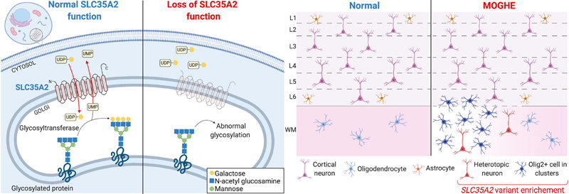 Figure 4: Simplified representation of pathophysiology and neuropathology findings in SLC35A2-related MOGHE cases On the left: SLC35A2 loss-of-function variants cause a defect in protein/sphingolipid glycosylation in the cell. On the right: Loss of SLC35A2 function leads to a MOGHE phenotype, with clusters of increased density of Olig2-positive cells in the white matter and deep cortical layers. L1-L6: layers 1-6; WM: white matter; Figure taken from 29, an open access article distributed under the terms of the Creative Commons CC BY license. In 2021, another comprehensive study described the clinico-pathological and molecular presentation of FCD ILAE Type 1A33. Holthausen identified a cohort of 19 young children with drug-resistance from seizure onset and severe EEG abnormalities almost always emphasized in the posterior (temporo-parieto-occipital) quadrant. The lack of focal neurological deficits but severe cognitive impairment was another hallmark of Holthausen’s disease. Important for the diagnostic work-up is the MRI signature presenting as subtle hypoplasia of the epileptogenic area with focus on the white matter. Abundance of cortical microcolumns, best visible by immunohistochemical stainings using NeuN antibodies and detected in all 19 cases assigned Holthausen’s disease to FCD ILAE Type 1A (Figure 5), molecularly confirmed by DNA methylation analysis. These defining features coined the provisional term “multilobar unilateral hypoplasia with severe epilepsy in children (MUHSEC) and is referred to Holthausen’s disease herein. To the best of my knowledge, this case series is a first comprehensive electro-clinical and anatomo-pathological description of a pure FCD ILAE Type 1 cohort in the contemporary peer reviewed literature. The three FCD1 subtypes have been almost hypothetically defined by the ILAE classification scheme as architectural abnormality of the 6-layered neocortex without frank signs of cytopathology, i.e., dysmorphic neurons or balloon cells. Up to date, there is no clear description available for either FCD 1B (horizontal dyslamination) or FCD 1C (horizontal and vertical dyslamination), although the latter is often associated with developmental vascular lesions, e.g., meningeal angiomatosis of Sturge-Weber34, or perinatal stroke, and assigned to FCD 3C or 3D, respectively (Figure 5)6,35. There was always concern that different patterns of cortical dyslamination are caused by different aetiologies and pathophysiological mechanisms, which will have implications for the diagnostic work-up as well as for the therapeutic management36. Yet, we have to await further studies until the issue of FCD Type 1 subtypes and their clinical relevance for patient management and treatment options will be finally resolved.