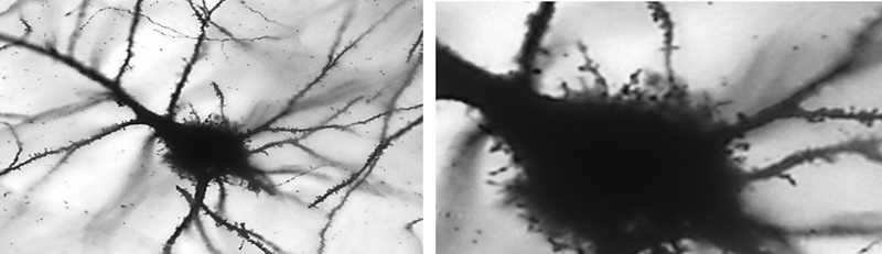Figure 6: Filopodia-like protrusions in dysmorphic neurons of FCD 2B Low power microphotographs of Golgi-impregnated dysmorphic neuron from a FCD 2B on the left, showing the presence of numerous short filopodia-like protrusions emerging from the soma. Higher magnification on right. Modified from 60 with permission from the author. The missing TOPIC 10: What is still missing to further the advancement of neuropathology and epilepsy surgery? We are already facing another major advancement in neuropathology, which will soon be recognized as the era of digital neuropathology. Artificial intelligence (AI)-based disease classifier and ever growing digital slide suites will substitute the routine work-up and may be able to also predict essential molecular features of the underlying disease condition to inform precision medicine treatment. These topics have not yet been publicized in peer reviewed journals with the exception of a deep learning-based algorithm to differentiate FCD Type 2 from cortical tuber on routine H&E-stained glass slides in 202062. AI-based algorithms may even be able to replicate histochemical and immunohistochemical stainings from unstained slides without actually performing the staining procedures63,64. This potential is yet to be fully explored, including within the field of neuropathology and epilepsy surgery, and we will await upcoming publications addressing this fascinating matter as it may well reshape our next future in neuropathology. Conclusion During the past decade, there have been considerable advances in understanding the genetic and morphogenic processes underlying cortical malformations and developmental brain tumors15. Focal brain malformations result from somatic (post-zygotic) variants in several genes related to the mTOR pathway in Focal Cortical Dysplasia Type 2, AKT3, DEPDC5, MTOR, NPRL2/3, PIK3CA, RHEB, TSC1/2 and others, or in the galactose transporter gene SLC35A2 in MOGHE, which were acquired early during cortical development. The timing of the genetic event, the specific gene involved and the targeted precursor cell population will determine the nature and size of the lesion, whether developmental malformation or a brain tumor. There is also emerging evidence of epigenetic processes underlying a ‘molecular memory’ in epileptogenesis22, which also helped to establish a diagnostic DNA methylation classification scheme21. This knowledge will finally accumulate into a better understanding of why and how patients with these lesions have epilepsy and to move toward precision medicine in patients with drug-resistant focal epilepsy. These topics will be continuously addressed and discussed also at the annual ILAE summer school of Neuropathology and Epilepsy Surgery (https://www.ilae.org/congresses). Please address your application to bluemcke[at]uk-erlangen.de References