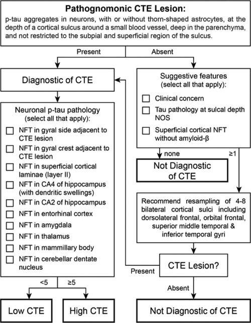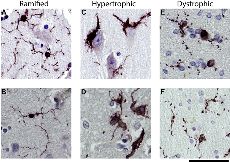 Figure 1. Examples of ramified (A, B), hypertrophic (C, D) and dystrophic microglia (E, F) reproduced with permission from Shahidehpour et al. (Shahidehpour et al., 2021). 2. Pathogenetic study in PART clarifies genetic overlap with AD and identifies JADE1 In 2014, a group of neuropathologists, led by the author of this article, defined criteria for a new category of neurodegenerative change, termed primary age-related tauopathy (PART) (Crary et al., 2014). Subsequently, there have been many clinical and neuropathological studies that have explored the contours and implications of this designation, both challenging and supporting its scientific validity as an independent age-associated neurodegenerative category. While the terminology has been broadly adopted, PART remains controversial and poorly understood. One of the biggest gaps in knowledge is the extent to which PART represents a distinct pathological process or shares mechanistic underpinnings with AD and perhaps the other tauopathies. This was addressed with the first genome-wide association study (GWAS) in primary age-related tauopathy published online in November 2021 in Acta Neuropathologica (Farrell et al., 2022). Given that PART is a ubiquitous neuropathological feature in essentially all aged human brains, Farrell et al. conducted a case-only quantitative trait analysis using Braak neurofibrillary stage as an endophenotype. While this was a relatively small GWAS (n=647), it was noted that most similar studies rely on clinical phenotypes, which are noisy relative to autopsy-derived endophenotypes, such as the Braak neurofibrillary tangle (NFT) stage used in this study. Looking at candidate genes implicated in Alzheimer’s disease and tauopathies revealed some associations, inducing with the MAPT H1 haplotype and other candidate loci, including SLC24A4, MS4A6A, HS3ST1 and EIF2AK3. As with previous studies, there was no association between PART and the most important and common risk allele for sporadic Alzheimer’s disease, APOE. The study also identified a novel locus on chromosome 4 that met genome-wide significance. Given that the locus contains a number of genes, the investigators used a computational approach, including examination of a single-cell tangle-containing RNA-seq dataset, to nominate gene for apoptosis and differentiation in epithelia 1 (JADE1) as the best candidate in the locus. The JADE1 protein has some interesting neuropathological features, co-localizing by immunohistochemistry with NFT in all tauopathies except Pick disease, the prototype tauopathy with three microtubule-binding domain repeats (3R). This was intriguing given that JADE1 protein biochemically interacts with only tau isoforms that contain 4 microtubule-binding domain repeats (4R). Finally, the JADE1 homolog in Drosophila, rhinoceros (rno), was shown to be a potent regulator of cell death in the fly eye and brain. Together, these findings suggest that JADE1 might be a component of a pathway that shared by many tauopathies. 3. Neuropathological criteria for chronic traumatic encephalopathy: consensus update As awareness and scientific interest in chronic traumatic encephalopathy (CTE) continues to expand, the neuropathological criteria continue to be a focus area. Concussions are extremely common, especially in military populations and contact sports athletes, and the long-term neurological sequelae remain under-investigated. Previously, the NIH convened a consensus panel of neuropathologists to establish preliminary consensus criteria for the neuropathological diagnosis of CTE (McKee et al., 2016). This landmark study has been highly influential, but questions persisted. For example, it was unclear as to what is the minimum requirement for a CTE diagnosis. Further, it was important to know whether CTE could be reliably differentiated from age-related tauopathies like primary age-related tauopathy (PART) and aging-related tau astrogliopathy (ARTAG). Further, a four-tiered staging system has been proposed but has not been independently validated (McKee et al., 2013). To address this, the NIH convened a second consensus panel meeting with eight neuropathologists expert in neurodegenerative tauopathies (Bieniek et al., 2021). The panel blindly reviewed 27 cases (17 CTE and 10 other tauopathies), applying the 2016 CTE criteria. First, there was substantial agreement in the diagnosis across raters which validated the robustness of the approach. Next, the panel turned to staging and developed a simplified and practical tool for the assessment of the CTE stage (Figure 2). The tool involves assessment of the 11 brain regions proposed by the first consensus meeting with a minimum threshold as a single pathognomonic lesion (with or without glial tangles). A point system was devised encompassing the numerous features of CTE with a cutoff of five, dichotomizing “low" and “high" CTE neuropathologic change. This simplified system had excellent correlation with the CTE stage as previously described (McKee et al., 2013). Numerous challenges and controversies in the field remain, but this represents a milestone in establishing rigor and reproducibility in CTE autopsy studies and provides a foundation for further advances in the field.