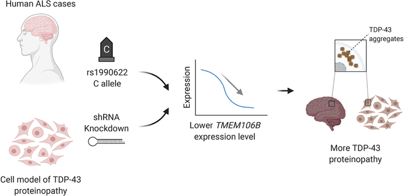 Figure 2. Flowchart for diagnosis of CTE reproduced with permission from Bieniek et al. (Bieniek et al., 2021). 4. A causal role for TMEM106B in TDP-43 pathology Inclusions containing the TAR DNA-binding protein 43 (TDP-43) are the hallmark neuropathological feature of a number of neurodegenerative diseases with divergent neuroanatomical vulnerability and symptomatology including amyotrophic lateral sclerosis (ALS), frontotemporal lobar degeneration (FTLD-TDP), and limbic age-related TDP-43 encephalopathy (LATE). The underlying reasons for these divergent pathoanatomical signatures are unclear and numerous factors likely contribute. While mutations in the TDP-43 gene are only rarely associated with TDP-43 proteinopathy, genetic variation in other genes including TMEM106B and C9orf72 are much more frequent in this context. To explore this, Mao et al. performed a rigorous pathoanatomical study published in Acta Neuropathologica examining the influence of genetic variation in TMEM106B and C9orf72 on the burden and distribution of TDP-43 proteinopathy in 899 brains from the University of Pennsylvania Center for Neurodegenerative Disease Research (CNDR) brain bank, including cases with ALS, FTLD-TDP, Alzheimer’s disease and Lewy body disease (Mao et al., 2021). TMEM106B risk alleles for FTLD-TDP were demonstrated to modify TDP-43 burden in ALS (but curiously not in FTLD-TDP). C9orf72 expansion was associated with TDP-43 burden in both ALS and FTLD-TDP. The interaction between TDP-43 and TMEM106B was confirmed in a cellular model. These data are intriguing because they suggest a causal role for TMEM106B in some forms of TDP-43 pathology (Figure 3).