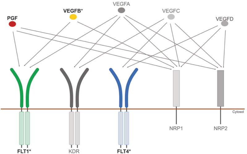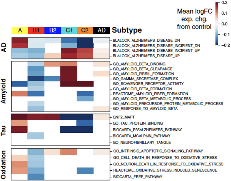 Figure 4. Molecular subtypes of Alzheimer’s disease defined by gene expression changes. Changes in the mean expression of gene pathways are indicated for AD subtypes A, B1, B2, C1 and C2 in comparison to normal control samples. Data from a previous study MSigDB are indicated on the right. Changes in gene expression are grouped by major areas of biological activity. Reproduced with permission from Neff et al. (Neff et al., 2021). 6. Cerebrovascular disease: VEGF gene family expression in cognitive aging and Alzheimer’s neuropathology Vascular endothelial growth factor (VEGF) is an angiogenic factor induced by hypoxia that plays an important role in angiogenesis. The VEGF gene family has several members which interact with a complex set of receptors and co-receptors which trigger (Figure 5) various signaling pathways highly relevant to neurodegeneration such as neurogenesis, neuroprotection, apoptosis, cell proliferation, and inflammation. Likewise, previous studies have linked VEGF signalling to various neurodegenerative and cerebrovascular diseases.