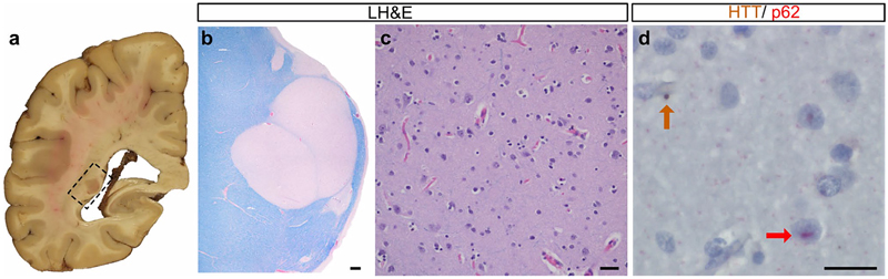 Figure 6. A periventricular nodular heterotopia (PNH) in a 41-year-old woman with HD. Gross (a) and low power (LH&E stain) images (b) of a subependymal heterotopia containing non-dysmorphic neurons (c) that are immunopositive for HTT and p62 (d, arrows). Reproduced with permission from Hickman et al. (Hickman et al., 2021). 9. Criteria for Lewy body pathology: approaching consensus The spectrum of Lewy body disease (LBD) pathology includes Parkinson’s disease (PD), dementia with Lewy bodies (DLB) and PD with mild cognitive impairment or dementia. Currently, a neuropathological diagnosis of Lewy body disease can be rendered using any of four different proposed systems (Adler et al., 2019; Braak et al., 2003; Leverenz et al., 2008; McKeith et al., 2005). All use semi-quantitative assessment of the neuroanatomical distribution of Lewy pathology in neurites and cell bodies, but each has specific strengths and weaknesses. Each system suffers from issues related to interrater reliability and/or the inability to classify certain cases with Lewy pathology (LP), for example cases with olfactory bulb-only or amygdala-only disease. This stems from the heterogenous pathoanatomical distribution of LP. In 2021, new neuropathological consensus criteria that aim to address the limitations of these systems, termed the LP consensus criteria (LPC), were developed and published in Acta Neuropathologica in order to improve interrater reliability and to unequivocally classify all possible cases with LP (Attems et al., 2021). To improve inter-rater reliability, the authors implemented a dichotomized scoring system, with LP scored as either present or absent. The diagnostic categories were: olfactory-only, amygdala-predominant, brainstem, limbic, and neocortical LP. The 16 raters from 13 centers applied the LPC and each of the four existing systems to 34 cases with LP from the Newcastle Brain Tissue Resource and the University of Pennsylvania Brain Bank. Interrater reliability was good for the LPC, being comparable to the McKeith and Leverenz system (Krippendorff’s alpha ≈ 0.6), and considerably better than for Braak and Adler (Beach). The LPC system was as applicable as the Beach system and able to unequivocally classify essentially all cases, which was not the case for the Leverenz, McKeith and Braak systems which failed in 10%, 25% and nearly 30% of cases respectively. Given the reliability and applicability of the LPC system, we expect that it will be adopted broadly in the post-mortem evaluation of cases with Lewy body pathology. 10. Long-COVID intersecting with neurodegeneration During the COVID-19 pandemic, a number of neuropathological studies addressed the changes in the human brain from patients succumbing to acute SARS-CoV-2 infection. Microthrombi and strokes were among the most common findings together with indirect inflammatory and autoimmune changes but encephalitis was rare. After the peak of the pandemic, roughly one third of patients emerged with a clinical syndrom often termed post-acute sequelae of SARS-CoV-2 infection (PASC) and commonly referred to as “Long-COVID". Cardiac and pulmonary symptoms are prominent in PASC but there are also many alarming non-specific neurological and psychiatric symptoms including fatigue, cognitive complaints (“brain fog"), sensorimotor defects, headaches, insomnia, depression, and post-traumatic stress disorder (Taquet et al., 2021). A meta analysis confirmed decreased cognitive function seven months following COVID-19 infection (Crivelli et al., 2022). PASC has drawn attention in the field of neurodegeneration given the possibility that infection with the virus may trigger a long-term neurodegenerative process (Lennon, 2020). The mechanisms whereby PASC may be linked to neurodegeneration remained however elusive. Many investigators have raised the questions as to whether SARS-CoV-2 can cause neurodegeneration through its neurotropism or otherwise (Krey et al., 2021). Some investigators have proposed that SARS-CoV-2 enters the brain and may activate an AD-like program (Shen et al., 2022). The ACE2 COVID-19 receptor was indeed shown to be upregulated in the hippocampal formation of AD patients (Zhao et al., 2021), which may explain why medial temporal lobe structures might be vulnerable, potentially contributing to some post-infection memory impairment and neurodegeneration (Ritchie et al., 2020). Notably, signaling pathways leading to tau hyperphosphorylation in AD including GSK3β may be activated in post-mortem COVID-19 brains (Reiken et al., 2022). AD- and COVID-19 signaling pathways may converge at the level of the NRLP3 inflammasome through dysregulation of amyloid clearance by microglia (Cama et al., 2021, p. 3). Alternatively, SARS-CoV-2 infection may worsen AD for various reasons (Villa et al., 2022). While this constitutes perhaps the most urgent and potentially important research trend at this time, it remains to be seen whether there will be sustainable momentum. Acknowledgement Dr. Crary receives research funding from the NIH (R01AG054008, R01NS095252, R01AG062348, R01NS086736, U54NS115266, U54NS115322). We further acknowledge the Rainwater Charitable Trust/Tau Consortium, David and Elsie Werber, Alexander Saint Amand Scholar Award and Karen Strauss Cook Research Scholar Award. References Adler, C. H., Beach, T. G., Zhang, N., Shill, H. A., Driver-Dunckley, E., Caviness, J. N., Mehta, S. H., Sabbagh, M. N., Serrano, G. E., Sue, L. I., Belden, C. M., Powell, J., Jacobson, S. A., Zamrini, E., Shprecher, D., Davis, K. J., Dugger, B. N., & Hentz, J. G. (2019). Unified Staging System for Lewy Body Disorders: Clinicopathologic Correlations and Comparison to Braak Staging. Journal of Neuropathology and Experimental Neurology, 78(10), 891–899. https://doi.org/10.1093/jnen/nlz080 Attems, J., Toledo, J. B., Walker, L., Gelpi, E., Gentleman, S., Halliday, G., Hortobagyi, T., Jellinger, K., Kovacs, G. G., Lee, E. B., Love, S., McAleese, K. E., Nel