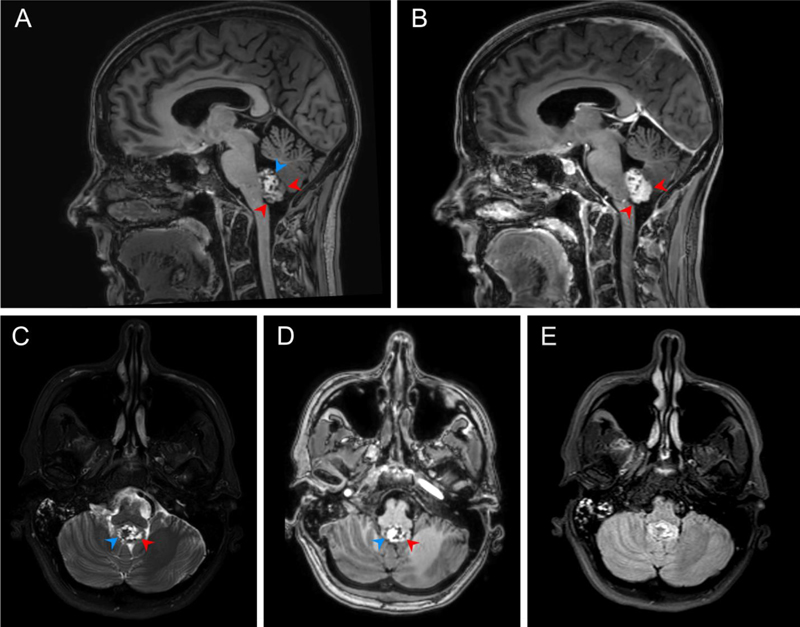 Figure 1. A. Sagittal pre-contrast T1 demonstrates an intraventricular mass involving the floor of the fourth ventricle and heterogenous T1 signal with areas of prominent intrinsic T1 hyperintensity (blue arrow), areas isointense to brain (red arrows), and scattered areas of low signal. B. Fat saturated sagittal post-contrast T1 demonstrates enhancement of the previously isointense portions (red arrows) with persistent areas of low signal. C. Axial fat saturated T2 at the level of the lesion demonstrates cystic areas of high T2 signal (red arrow) which correspond to low intensity of pre-contrast T1. D. A prominent low signal area on T2 is intrinsically bright on T1 (blue arrow), suggesting high protein and/or lipid contents. E. Axial FLAIR demonstrates predominantly iso- to hyperintense signal.