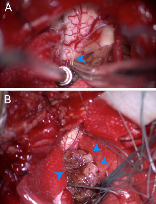 Figure 2. Intraoperative photographs of the tumor demonstrating: A. dissection of arachnoid bands tethering the tumor to the floor of the fourth ventricle and B. the macroscopic appearance of the lesion with notable grey-brown color (blue arrows).