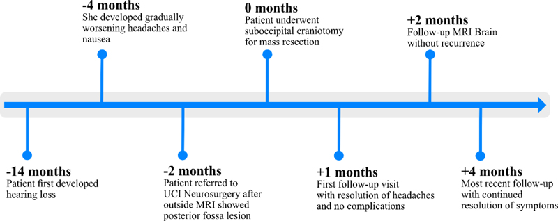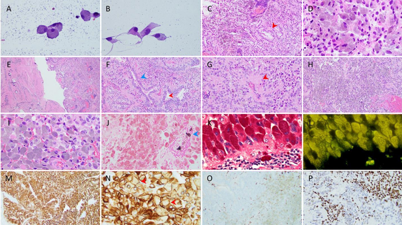 Figure 3. Patient care timeline. Pathology Intraoperative smears showed pigmented cells often with swollen granular cytoplasm mimicking macrophages (Fig. 4A), as well as a population of cells with ovoid nuclei and a moderate amount of cytoplasm with variably epithelioid features (Fig. 4B). Intraoperative frozen sections showed perivascular chronic inflammation, abundant pigmented cells and sheets of tumor cells with epithelial surfaces mimicking glands, but reflecting ependymal rosettes or canals (arrowhead) (Fig. 4C). The pigment was fine and grey-brown in micrographs of the frozen section (Fig. 4D). Figure 4. Staining is with hematoxylin and eosin (H&E) unless otherwise specified. A. (400X) Smear- swollen pigmented tumor cells. B. (400X) Smear- unpigmented and pigmented tumor cells. C. (100X) Frozen section- “epithelial” surfaces resembling glands (red arrowhead). D. (400X) Frozen section- Fine, grey-brown pigment. Figures E-I are from permanent sections. E. (40X) Cellular tumor (right fragment) and areas reminiscent of subependymoma gliopil (left fragment). F. (100X) Ependymal canal (blue arrowhead) and pseudopapillary configuration (red arrowhead). G. (200X) Perivascular pseudorosette (red arrowhead). H. (100X), I. (400X) Swollen pigmented cells. J. (200X) Fontana-Masson stain- tumor cells negative; few perivascular macrophages positive (blue arrowhead). K. (600X) PAS stain. L. (600X) Fluorescence microscopy shows autofluorescence. M. (200X), N. (400X) GFAP- pigmented cells immunopositive (red arrowheads). O. (200X) CD163- tumor cells negative; scattered microglia immunopositive. P. (200X) H3K27me3- loss in subset of tumor cells. Clicking into the figure will lead you to the full virtual slide. Permanent sections showed tumor tissue that was mostly cellular (right fragment) with minor areas where the background consisted of an eosinophilic gliopil (left fragment) (Fig. 4E). Ependymal canals (blue arrowhead) were focally prominent, sometimes suggesting a papillary configuration (red arrowhead) (Fig. 4F). Perivascular pseudorosettes could also be seen (Fig. 4G). Swollen cells with grey-brown pigment were abundant in some areas (Fig. 4H, I). The pigmented cells were negative for melanin and neuromelanin by Fontana-Masson (Fig. 4J); only scant focal often coarser and/or larger black-staining pigment was seen extracellularly and in a few perivascular macrophages (arrowhead). These cells stained strongly with PAS (Fig. 4K) and were autofluorescent with fluorescence microscopy (Fig. 4L). Concerning the GFAP staining, the tumor was diffusely and strongly positive (Fig. 4M), as were the swollen pigmented cells, which showed GFAP staining at the cytoplasmic periphery (arrowheads) consistent with a glial origin (Fig. 4N). Both unpigmented and pigmented tumor cells were negative for the macrophage marker CD163; with only scattered, interspersed, small darkly staining microglia (Fig. 4O). Collectively, these findings indicated a lipofuscin-pigmented ependymoma. An H3K27me3 immunostain showed immunonegativity in approximately 20-30% of tumor cells, but did not show global loss (Fig. 4P). Whole slide digital images of frozen H&E (sFig. 1), permanent H&E (sFig. 2), PAS (sFig. 3), GFAP (sFig. 4) and H3K27me3 (sFig. 5) slides are available in the Supplement section. DNA Methylation Arrays and Analysis Methylation profiling was performed at the National Institutes of Health (NIH), Bethesda, MD, USA. Genomic DNA was extracted from formalin-fixed paraffin-embedded (FFPE) tissue sections on slides using an AllPrep DNA/RNA FFPE kit (Qiagen, Venlo, Netherlands). The DNA was bisulfite-converted using the EZ DNA Methylation Kit (Zymo Research, Irvine, CA, USA), and processed to create a beadchip (850K methylation sites) using the Infinium Methylation EPIC kit (Illumina, San Diego, CA, USA). The beadchip was then scanned on the iScan reader (Illumina). Methylation profiling was carried out through an NIH pipeline using UMAP, the NCI-EPIC methylation classifier, and the Heidelberg classifier (brain, versions 11b6 and 12.5), obtained from the German Cancer Research Center in Heidelberg, Germany. The sample was classified as ependymoma, posterior fossa group B with a score of 0.47 on version 11b6, and the same methylation class with a higher score of 0.98 on version 12.5 of the Heidelberg classifier. On the UMAP, this sample embedded with the EPN_PFB cluster (Fig. 5). The consensus methylation profile, in the context of the clinical and histopathologic features, supported EPN_PFB, CNS World Health Organization (WHO) grade II.