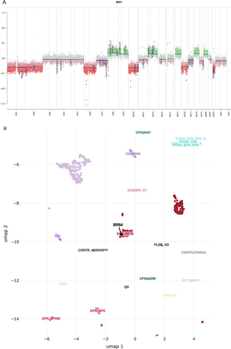 Figure 5. Methylation analysis results. A. Genome-wide copy number profile generated from DNA methylation array signal intensities. The copy number profile shows numeric whole chromosome changes, which are typical for EPN_PFB group. B. The UMAP embedding of DNA methylation array data for select tumor groups. Sample tumor embeds with EPN_PFB tumor cluster. Discussion Ependymomas are glial neoplasms with a slight male predominance that represent, approximately, 2-6% of all intracranial tumors and 50% of intramedullary spinal tumors.11,12 Much less common are pigmented ependymomas.2 These rare tumors may contain three types of pigment: melanin, neuromelanin, or lipofuscin.13 The most common pigment in pigmented ependymomas is melanin, a tyrosine derivative present in the choroid of the eye and, sometimes, in the meninges.13 Rarely, pigmented ependymomas contain neuromelanin, which is likely produced by nonenzymatic oxidation of dopamine or lipofuscin. Lipofuscin arises from iron-catalyzed peroxidation of membrane lipids and lipoproteins within lysosomes, and tends to accumulate with cellular aging.2,13 A recent case report and literature review on pigmented ependymomas describes only one previous case, in which lipofuscin was discovered to be the sole pigment contained within a pigmented ependymoma in a 16-year-old male.2 Here, we report on an additional case of lipofuscin-pigmented ependymoma of the fourth ventricle in a 46-year-old female with the EPN_PFB subtype. Given the rarity of this entity, a literature review was performed using the PubMed and Scopus search engines to identify previously described cases of pigmented ependymoma. Keywords used included “pigment”, “melanin”, “lipofuscin”, “neuromelanin” and “ependymoma”. This yielded 8 total studies2,8,9,14-19 reporting on 16 total patients with pathologically confirmed pigmented ependymoma (Table 1). Melanin was the most common pigment found in these ependymomas (n=12, 70.6%), followed by lipofuscin and neuromelanin (n=2, 11.8%) and lipofuscin alone (n=2, 11.8%). In one case, the pigment composition was not reported.16 Only two studies reported the tumor grade using the WHO classification.8,15 Six cases were WHO grade II, and two were WHO grade III anaplastic ependymoma according to the WHO schema at that time.