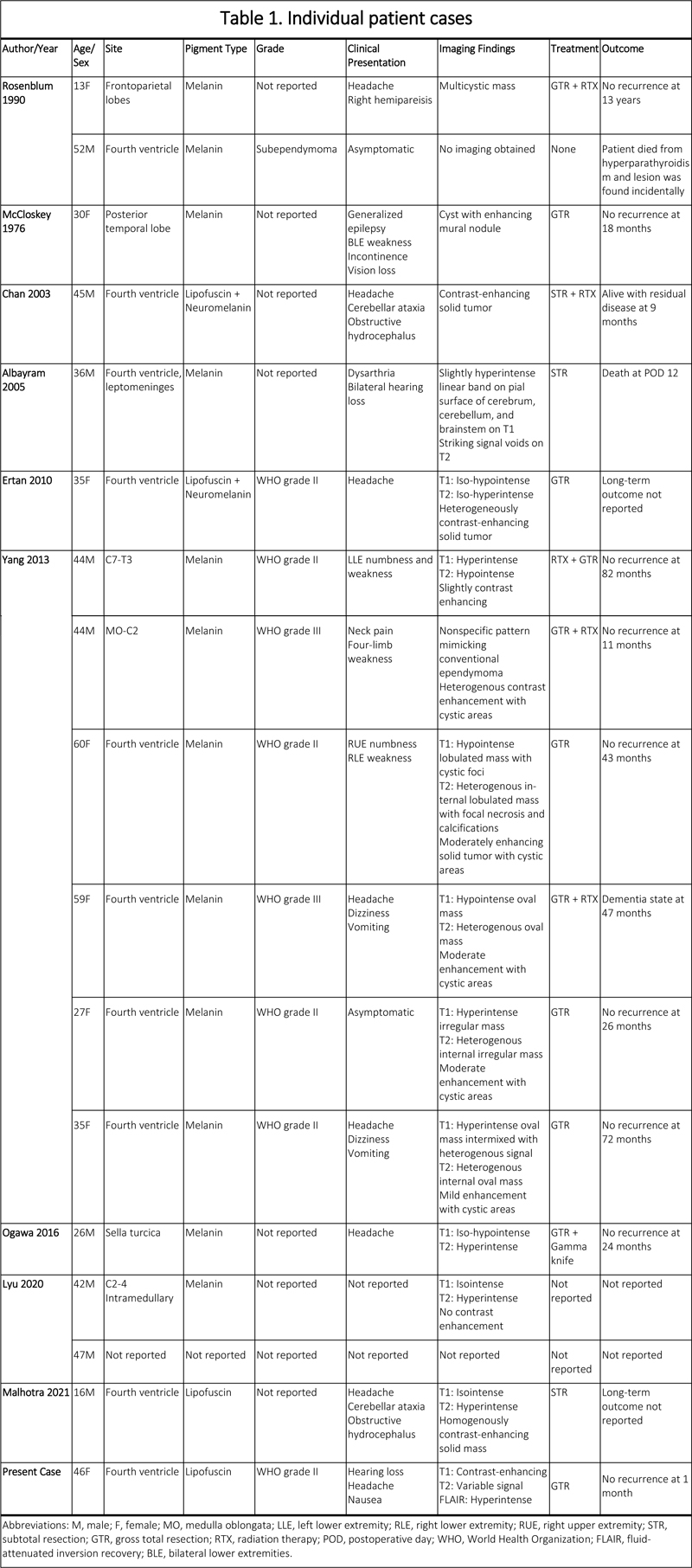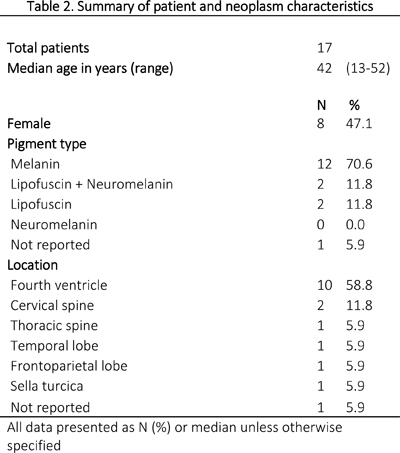 Abstract Ependymomas have rarely been described to contain pigment other than melanin, neuromelanin, lipofuscin or a combination. In this case report, we present a pigmented ependymoma in the fourth ventricle of an adult patient and review 16 additional cases of pigmented ependymoma from the literature. A 46-year-old female showed up with hearing loss, headaches, and nausea. Magnetic resonance imaging revealed a 2.5 cm contrast-enhancing cystic mass in the fourth ventricle, which was resected. Intraoperatively, the tumor appeared grey-brown, cystic, and was adherent to the brainstem. Routine histology revealed a tumor with true rosettes, perivascular pseudorosettes and ependymal canals consistent with ependymoma, but also showed chronic inflammation and abundant distended pigmented tumor cells that mimicked macrophages in frozen and permanent sections. The pigmented cells were positive for GFAP and negative for CD163 consonant with glial tumor cells. The pigment was negative for Fontana-Masson, positive for Periodic-acid Schiff and autofluorescent, which coincide with characteristics of lipofuscin. Proliferation indices were low and H3K27me3 showed partial loss. H3K27me 3 is an epigenetic modification to the DNA packaging protein Histone H3 that indicates the tri-methylation of lysine 27 on histone H3 protein. This methylation classification was compatible with a posterior fossa group B ependymoma (EPN_PFB). The patient was clinically well without recurrence at three-month post-operative follow-up appointment. Our analysis of all 17 cases, including the one presented, shows that pigmented ependymomas are most common in the middle-aged with a median age of 42 years and most have a favorable outcome. However, one patient that also developed secondary leptomeningeal melanin accumulations died. Most (58.8%) arise in the 4th ventricle, while spinal cord (17.6%) and supratentorial locations (17.6%) were less common. The age of presentation and generally good prognosis raise the question of whether most other posterior fossa pigmented ependymomas may also fall into the EPN_PFB group, but additional study is required to address that question. Introduction Primary pigmented tumors of the central nervous system (CNS) are rare entities and often contain melanin.1 Primary pigmented intracranial tumors include melanoma, melanocytoma, schwannomas,2 meningiomas,1 and, less commonly, gliomas,3 neurocytomas,4 ependymomas and choroid plexus tumors.2 Ependymomas are glial neoplasms found, most commonly, intracranially in the posterior fossa of children and within the spinal cord of adults.5 Prognosis primarily depends on location, with intracranial ependymomas harboring worse outcomes than spinal variants.6,7 Pigmented ependymomas are most commonly melanotic,8 although these neoplasms are often incompletely characterized in the literature. Furthermore, cases of pigmentation with neuromelanin and lipofuscin have been previously described.2,9 Nowadays, subtyping of ependymomas includes genetic and methylation profiling, therefore several methylation profiles have emerged which may correlate with clinical prognosis.10 Here, we describe a pigmented ependymoma of the fourth ventricle that contains lipofuscin and has a methylation profile consistent with a posterior fossa group B ependymoma (EPN_PFB). We also review the available published cases pertaining to pigmented ependymomas by characterizing their age distribution, location, clinical features and outcomes. Case History A 46-year-old Hispanic female presented with hearing loss for one year and worsening headaches and nausea for two months. Her physical examination revealed no focal neurological deficits. Magnetic resonance imaging (MRI) revealed a 2.2 x 1.5 x 2.6 cm mass involving the floor of the fourth ventricle, which showed marked intrinsic T1 hyperintensity, variable T2 signal (with areas of both hyperintensity and hypointensity), predominantly hyperintense fluid-attenuated inversion recovery (FLAIR) signal and areas of contrast-enhancement (Fig. 1). After informed consent to surgery and involvement in research (IRB ethics approval deferred as University of California, Irvine policy permits reports of up to 3 individuals), she underwent a suboccipital craniotomy for resection of the mass. Intraoperatively, the tumor appeared as a grey-brown cystic mass within the fourth ventricle that was tightly adherent to the posterior inferior cerebellar arteries and lower brainstem (Fig. 2). Radiographic gross-total resection (GTR) was achieved. The patient’s postoperative course was uncomplicated, and she was without radiographic recurrence and satisfied with her treatment at one- and three-month follow-up appointments (Fig. 3).