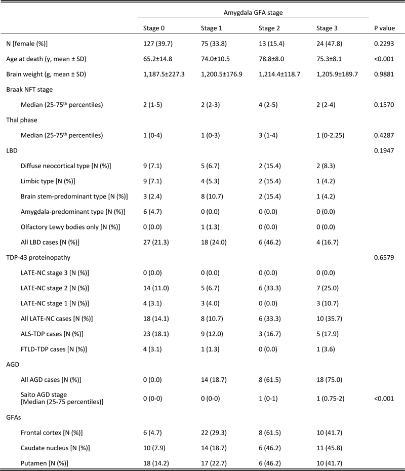 Cases of argyrophilic grain disease (AGD) frequently have astrocytes containing non-argyrophilic tau-positive fine granules in the foot processes sprouting from cell bodies in the amygdala. They were first called bush-like astrocytes by Botez et al. [1], and later they were classified as one of the age-related tau astrogliopathies and re-named granular fuzzy astrocytes (GFAs) [2]. In our previous studies, the formation of GFAs was not simply associated with age alone, and their distributions were influenced by underlying tauopathies [3,4]. Especially in AGD cases, GFAs preferentially develop in the amygdala rather than the frontal cortex and striatum [3]. Kovacs et al. previously noted the possibility that GFAs in the amygdala might be a forerunner of argyrophilic grains [5]. However, there is no comprehensive pathological data regarding the relationship between the frequencies and severities of AGD and GFAs in the amygdala, and whether argyrophilic grains develop in the absence of amygdala GFAs remains unclear. To address these issues, first, we analyzed the relationship between the presence or absence of AGD and the severity of amygdala GFAs in a case series. Then, their spatial relationship was examined using double staining with the Gallyas method and anti-phospho-tau (AT8) immunohistochemistry. Among a total of 1,166 autopsy cases registered in our database, 474 cases that were evaluated using modern standardized methods, including a panel of immunohistochemistry, modified Bielschowsky silver stain, and Gallyas-Braak silver stain from 2001 to 2022, were selected (Supplementary file 1). All cases died in psychiatric hospitals or neurological departments of general hospitals. Of these cases, we extracted 263 cases for which semiquantitative data of the AT8-positive GFAs, as well as the Saito AGD stage [6] (the distribution of argyrophilic grains in the cerebrum) assessed using the Gallyas method, are available. Then, 24 cases having progressive supranuclear palsy, corticobasal degeneration, Pick’s disease, globular glial tauopathies, post-encephalitic parkinsonism, and myotonic dystrophy were excluded because distinct tau-positive astrocytic lesions were noted. Finally, 239 cases were included in the present study. In all of these cases, GFAs were semiquantitatively assessed in the frontal cortex, caudate nucleus, putamen, and amygdala on AT8-stained sections, using the following grading system (GFA stage): stage 0, no lesion in the anatomical region (i.e., the superior frontal gyrus, caudate nucleus, putamen, and amygdala); stage 1, more than one lesion in the anatomical region but less than one lesion per ×200 visual field; stage 2, one lesion per ×200 visual field; or stage 3, two or more lesions per ×200 visual field. Among the 239 cases, 112 had at least one GFA in the amygdala, while 127 lacked amygdala GFAs (amygdala GFA stage 0) (Table 1). The age at death was significantly higher in the amygdala GFA stage 1, 2, and 3 groups than in the amygdala GFA stage 0 group (p<0.001, 0.0025, and 0.0023, Kruskal-Wallis and Steel-Dwass tests). However, the sex ratio, brain weight, Braak stage, Thal phase, proportions of Lewy body disease (LBD) pathological subtypes, and proportions of TAR DNA-binding protein 43 (TDP-43) proteinopathy pathological subtypes did not significantly differ between the four amygdala GFA stage groups. Table 1. Demographic data in all subjects stratified by severity of GFAs