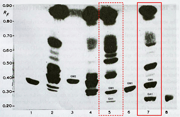 Figure 1. Original chromatography analysis by Sandhoff: “Kn” = lane 7. Formalin-fixed control = lane 5 (Photography by K. Sandhoff, gangliosides labelled; original legend). See full article by Jatzkewitz & Sandhoff 1963 [14] in supplement 1 (illustrating the metabolic path).Thin-layer chromatogram of lipid extracts of brain tissue from two usual infantile cases and one from one special form of late-infantile amaurotic idiocy (Jatzkewitz and Sandhoff 1963) Adsorbent, 400-µm-thick layer of Kieselgel G, Merck; solvent system, propanol-conc. ammonia-water (6:2:1); height of the solvent front, 15cm; detection, anisaldehyde, sulfuric acid in acetic acid (reagent of Kägi-Miescher). 1, 20µg of neuraminic acid-free residue of ganglioside Tay-Sachs (B’, now named GA2, RF 0.33); 2, 250µg of total lipid extract of the brain cortex of a case of iai (fresh tissue); 3, 20µg of ganglioside Tay-Sachs (A’, GM2, RF 0.37); 4, 250µg of total lipid extract of the brain cortex of a case of iai, preserved for formalin for 26 years; 5, 250µg of total lipid extract of normal brain cortex, preserved in formalin for 26 years; 6, 20µg of ganglioside A (GM1, RF 0.30); 7, 250µg of total lipid extract of the brain cortex of a special form of late iai, preserved in formalin for 26 years; 8, 20µg of neuraminic acid-free residue of ganglioside A (GA1, RF 0.26). [Author’s addendum: RF means “Retention factor”]. What exactly was new based on the knowledge back then? Up to this 1963 study’s result, AI and TSD was perceived as an entity with varying clinical courses and was classified according to manifestation age. Classic microscopic histomorphological analysis was not able to clearly differentiate between various entities, and therefore could not resolve the AI-enigma, maybe except separation of the “Neuronal Ceroid-lipofuscinoses” (NCL) as a separate group in AI-like disease ([46-48] [57]). Of note, NCL as a term was coined later ([50],[62]). The biology and biochemical nature of these diseases were largely unknown. What turned out as being correct or incorrect since then? Some authorities were convinced that essentially everything was already known about TSD up to 1960. As late as 1957, Seitelberger had stated that “…it has been…proven, that the cellular metabolic disturbance constituting the individual forms [of TSD] are mainly the same” [49]. When K. Sandhoff - following his analysis of a randomly selected first AI-case - searched for further brain specimens in Munich neuropathology archives, he was confronted by the institute’s head G. Peters, who told him boldly: “…if you aim to know about Tay-Sachs-disease, read my book and you will know everything” (Sandhoff, personal memory). This was the starting point. Newly developed biochemical analytic methods opened new windows: it turned out that diverse lipid compounds represent essential building blocks of nervous tissue, that their metabolism is highly sophisticated biochemically and can be altered causing various specific diseases (for review see [45], [2]). Concerning the “biochemically special form” of AI as identified in 1963, the postulated metabolic block in ganglioside A degradation later was identified and characterized as impairment of specific enzyme activities, mostly beta-galactosidase ([2], [16], [44]). At what stage of the author´s career was the paper published? K. Sandhoff was a young student at the very beginnings of his career as a researcher (Figure 2).