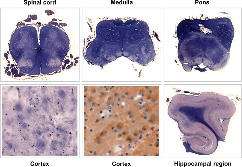 Figure 3. Original historical slides from selected CNS sites of patient “Kn”. Specimen were well preserved stained Mallory, an additional neocortical specimen underwent some “fat-stain”, not otherwise specified (scanned with Zeiss AxioScan.Z1). The cerebral slides (lower row: neocortex and hippocampal region) illustrate the severe cortical pathology characterized by shrinking of the cortical band with profound loss of neurons. Residual neurons show the typical swollen, ballooned morphology of a CNS lipidosis. When going into detail on large magnifications, the neuronal pathology is seen well in brainstem also, esp. in the medulla/olive specimen (upper row, middle). Within the hippocampus proper there seems to be profound loss of pyramidal neurons, which could represent hippocampal sclerosis (this specimen was not available in other stains).