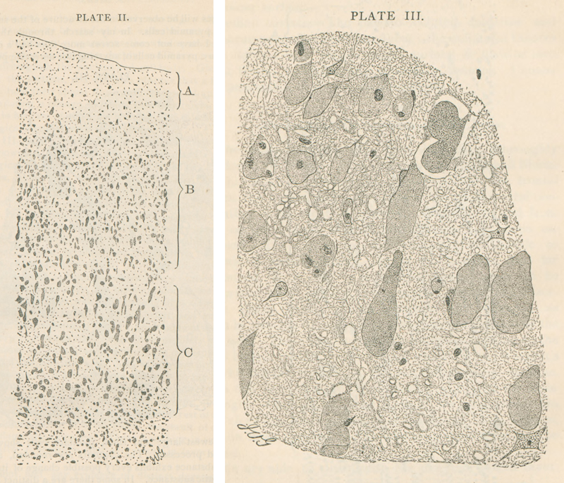 Figure 4. Original drawings by I. van Gieson (1866-1913), from Sachs’s publication 1887 [36] (Courtesy of the National Library of Medicine). See supplement 8. Have the original materials been used for modern molecular approaches and what was the result? To the best of our knowledge, the original materials of the patient Johann Knott presented here so far were not used for any modern molecular analysis later on, although materials participated in one subsequent ganglioside quantification analysis [15]. For this re-visitation, we performed a genetic analysis using a selected fraction of Kn’s archived material using only sections no longer usable for microscopy due to aging effects. This procedure was covered by a positive vote of the ethics commission at Munich University/LMU (Nr. 22-1021): Materials & Methods: Formalin-fixed paraffin-embedded (FFPE) cerebellar sections from the Historical Archive of the Max Planck Institute for Psychiatry in Munich were used as follows. Genomic DNA was extracted from three stained sections. The slides were incubated in xylene (Bergchemie J. C. Bröcking) for 14 days to enable lifting of the cover slip. Tissue was overlayed with Incubation Buffer containing Proteinase K (Maxwell FFPE Plus DNA Kit, Promega), scraped from the surface using a scalpel and resuspended for transfer into a 1.5 ml reaction tube to perform DNA extraction using the Maxwell FFPE Plus DNA Kit (Promega). DNA was quantified using the QuantiFluor ONE dsDNA System (Promega) and 20 ng were subjected to the Infinium HD FFPE Restore Protocol (Illumina, Zymo). Finally, 1 µl of the restored gDNA was inspected by Genomic DNA ScreenTape assay (Agilent) to determine DNA Integrity Number (DIN) and concentration (Figure 5A). Although DNA integrity was low (1.0), the Exome 2.0 Kit (Twist Bioscience) could be successfully applied for library preparation and sequencing was performed on a NovaSeq 6000 device. After base calling and adapter trimming, alignment to the human reference genome (Homo_sapiens.GRCh37.75_complete) and variant calling were performed using Dragen v07.021.624.3.10.10. Variants were annotated using the variant effect predictor (v100) for functional annotations, pathogenicity scores, population allele frequencies and to determine the effect of called variants on genes, transcripts, and protein sequence. Variants were manually inspected with the integrative genomics viewer (IGV). Results are illustrated in figure 5.