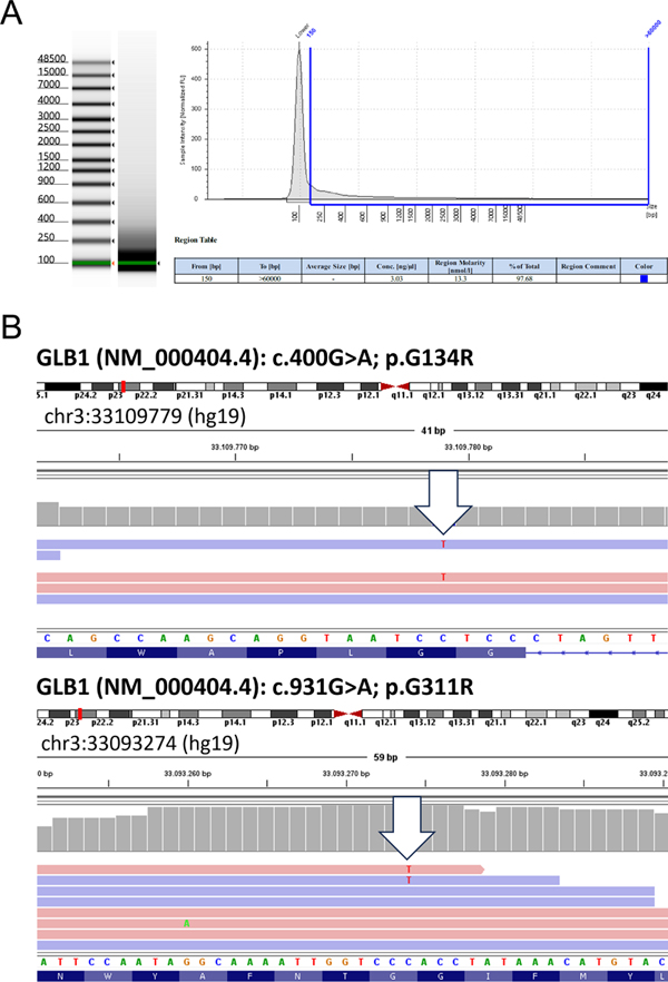 Figure 5. (A) DNA fragment analysis. Fragment analysis of gDNA isolated from formalin-fixed paraffin-embedded tissue shows high DNA degradation. The figure shows DNA fragment sizing and quantification using Genomic DNA ScreenTape assay. (B) IGV screenshots showing representative images of the two heterozygous mutations: GLB1 (NM_000404.4): c.400G>A; p.G134R (top) and GLB1 (NM_000404.4): c.931G>A; p.G311R (bottom). Both mutations have been described in patients with GM1 gangliosidosis [28]. Epilogue Amaurotic idiocy (AI), as exemplified by Tay-Sachs-Disease (TSD), had remained a fatal, enigmatic condition for a long period of time. AI’s impressive cellular pathology, affecting neuronal cells throughout the nervous system quite specifically, was recognized as early as 1887 ([36] supplement 8). After separating the tissue pathology later to be known as ceroid-lipofuscinosis [62; 46-48] classic neuromorphology for decades had not much to contribute to the differentiation of AI, for its CNS pathology appeared rather uniform [25]. Significant advances in this field were largely driven by biochemical insight into composition and distribution of central nervous compounds and by applying newly emerging techniques between 1920 and 1960, exemplified by the works of Klenk [19-21], Kuhn & Wiegandt [24], Svennerholm [53] and Sandhoff ([42], [45]). Sandhoff’s original observation [14] revisited here opened the door to the realization that TSD-like AI was not a homogenous entity, but a spectrum of neurometabolic diseases [2]. Triggered by detailed analysis of Johann Knott (Kn) and subsequent findings the field expanded and evolved rapidly ([2], [16], [44], [45]) leading to in depth characterization of the different forms of lipid storage disease, including enzymes & genes involved. Thus, GM1-gangliosidosis today can be summarized as a rare autosomally inherited lipid catabolism defect caused by deficiency of beta-galactosidase, encoded by the gene GLB1 on chromosome 3, leading to lysosomal storage of ganglioside GM1 and its sialic-free residue GA1 ([2], [16], [28]] encompassing various clinical forms ([3], [16], [52]). The term “AI” has long been abandoned and is now replaced by more specific terms representing our refined understanding. Acknowledgements