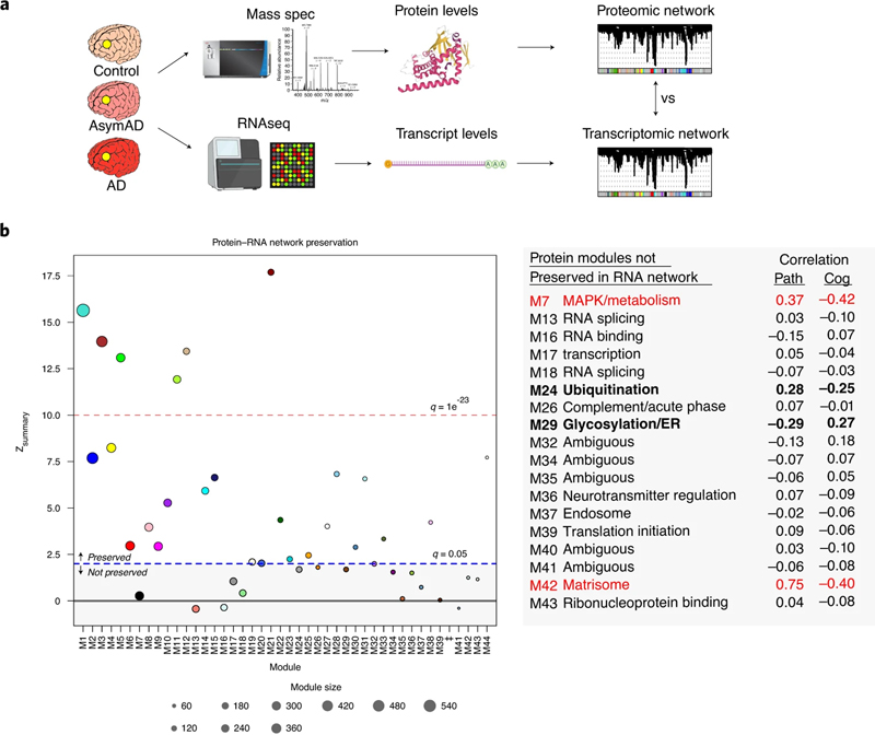 1. An integrated proteomic and transcriptomic analysis of Alzheimer disease reveals unique pathways beyond mRNA Powerful transcriptomic approaches are increasingly being applied to post-mortem Alzheimer disease (AD) tissues and other diseases. Historically, methods included hybridization-based microarrays and bulk RNA-sequencing, but increasingly single cell RNA profiling and spatial transcriptomics are becoming routine. Proteins, owing to their increased complexity, are more challenging to assess, but are ostensibly more proximate to the relevant alterations that drive neurodegeneration. A study by Johnson et al. entitled “Large-scale deep multi-layer analysis of Alzheimer's disease brain reveals strong proteomic disease-related changes not observed at the RNA level” analyzed proteomes of more than 1,000 brain tissues with a goal of trying to better understand the biological processes disrupted in AD (Johnson et al., 2022). The investigators deployed tandem mass tag mass spectrometry (TMT-MS), an approach used to quantitatively analyze and compare protein expression levels that uses isobaric tagging to enable multiplexed quantification of peptides and proteins. TMT-MS offers several advantages, including high multiplexing capacity, accurate and reproducible quantification, and the ability to analyze complex proteomes. Using this methodology, the research team identified new AD-related protein co-expression modules that were highly preserved across cohorts and brain regions. Remarkably, nearly half of the protein co-expression modules were not observed in mRNA networks. Two notable AD-associated modules that were unique to the proteomic network were related to mitogen-activated protein kinase (MAPK) signaling and the matrisome (Figure 1). The matrisome refers to the collection of extracellular matrix (ECM) proteins and associated factors and is a complex network of proteins and other molecules that provide structural support and regulate various cellular processes. The MAPK/metabolism module was associated with the rate of cognitive decline whereas the matrisome module was influenced by the APOE ε4 allele. These results indicate that pathways that are unique to the proteome could lead to therapeutic targets and biomarkers.