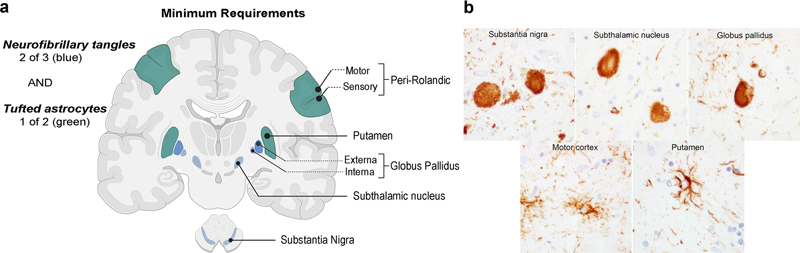 Figure 2. Rainwater neuropathological criteria for progressive supranuclear palsy. a. The minimum requirements are demonstration of neurofibrillary tangles in two any of three classically involved regions (e.g., the subthalamic nucleus, globus pallidus, and substantia nigra) alongside tufted astrocytes in the putamen or peri-Rolandic cortex. b. Examples of neurofibrillary tangles and tufted astrocytes on phospho-tau (AT8 antisera) immunohistochemical staining (reproduced with permission from Roemer et al., 2022 under the creative commons license). 3. Limbic-predominant age-related TDP-43 encephalopathy and Alzheimer disease: the impact of coexistence on cognition Limbic-predominant age-related TDP-43 encephalopathy neuropathologic change (LATE-NC) and Alzheimer disease neuropathologic change (ADNC) are both implicated in cognitive impairment among older individuals. However, the frequency of LATE-NC across the entire range of ADNC remains uncertain. To address this gap in knowledge, Nelson et al. performed a comprehensive analysis from 13 high-quality longitudinal studies, encompassing a total of 6,196 participants from diverse countries (Nelson et al., 2022). Among individuals with documented cognitive status prior to death, 43.0% were found to be cognitively normal, 14.9% had mild cognitive impairment, and 42.4% had dementia, consistent with epidemiological data for this age range. In cases with available CERAD neuritic amyloid plaque score data, 39.4% were confirmed to have LATE-NC at any stage based on autopsy findings. Notably, among brains with "frequent" neuritic amyloid plaques, 54.9% exhibited concurrent LATE-NC, while 27.0% of brains lacking detectable neuritic amyloid plaques displayed LATE-NC. Remarkably, LATE-NC was present in nearly 40% of participants and often coexisted with ADNC. Detailed neurocognitive assessments conducted proximate to death across 10 cohorts demonstrated a tendency for worse cognition in individuals with LATE-NC across the entire range of ADNC severity. None of the participants received a clinical diagnosis of definite frontotemporal dementia or a pathological diagnosis of frontotemporal lobar degeneration with TDP-43 inclusions. These findings provide valuable insights into the prevalence and interplay between LATE-NC and ADNC, highlighting their impact on cognitive function in the aging population.