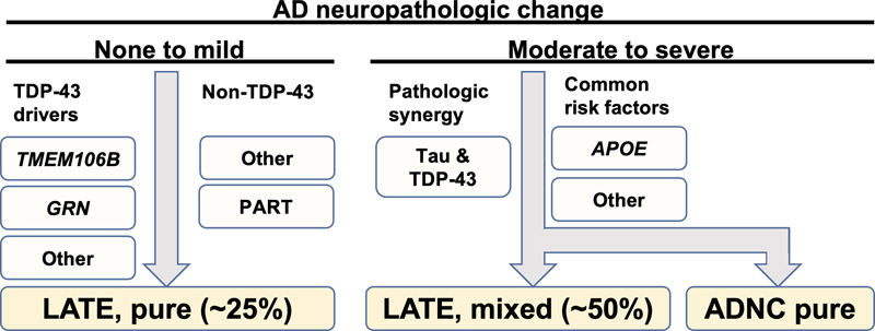 Figure 3. Frequency of limbic-predominant age-related TDP-43 encephalopathy neuropathologic change (LATE-NC) across the entire range of Alzheimer disease neuropathologic change (ADNC). In participants with minimal ADNC, ~25% have LATE-NC, suggesting ADNC-independent mechanisms. LATE-NC is associated with more severe primary age-related tauopathy pathology, indicating potential synergy. In subjects with severe ADNC, approximately 50% of participants had LATE-NC that may be driven by genetic factors (e.g., APOE genotype) or other factors. 4. TDP-43 represses cryptic exon inclusion in UNC13A Most amyotrophic lateral sclerosis (ALS) and a subset of frontotemporal lobar degeneration cases display TAR DNA-binding protein 43 (TDP-43) pathology. This is neuropathologically reflected by translocation of phosphorylated forms of the protein from the nucleus to the cytoplasm, a phenomenon that is readily visible on immunohistochemical stains. The significance and functional implications of this translocation are not clear, but may result in loss of TDP-43 function in the nucleus. TDP-43 is an RNA-binding protein with numerous roles, including repression of the inclusion of cryptic exons during splicing of heterogeneous RNA while in the nucleus. Previous studies have highlighted several genes, including POLDIP3 and STMN2 that exhibit aberrant splicing following TDP-43 depletion. In a paper by Ma et al., investigators sought to identify additional genes that exhibit cryptic splicing changes that are regulated by TDP-43 (Ma et al., 2022). Using post-mortem brain tissues from patients with Frontotemporal lobar degeneration (FTLD) and ALS, the authors used fluorescence-activated cell sorting to isolate nuclei with nuclear TDP-43 protein expression from nuclei lacking TDP-43 and performed RNA-seq. They found 66 genes with altered splicing using this analysis, including UNC13A, which had previously been identified in genome wide association studies with unclear mechanisms of increased risk. Specifically, they found a cryptic exon that is retained in cells with TDP-43 pathology that could be detected with exon splice site specific probes (Figure 4). Further cellular and histological validation supported these findings. It is known from studies in C. elegans and other systems that UNC13A encodes for a synaptic multidomain protein that participates in vesicle priming prior to fusion. These findings provide a direct mechanistic link between loss of TDP-43 function and a strong genetic risk factor for ALS-FTD.
