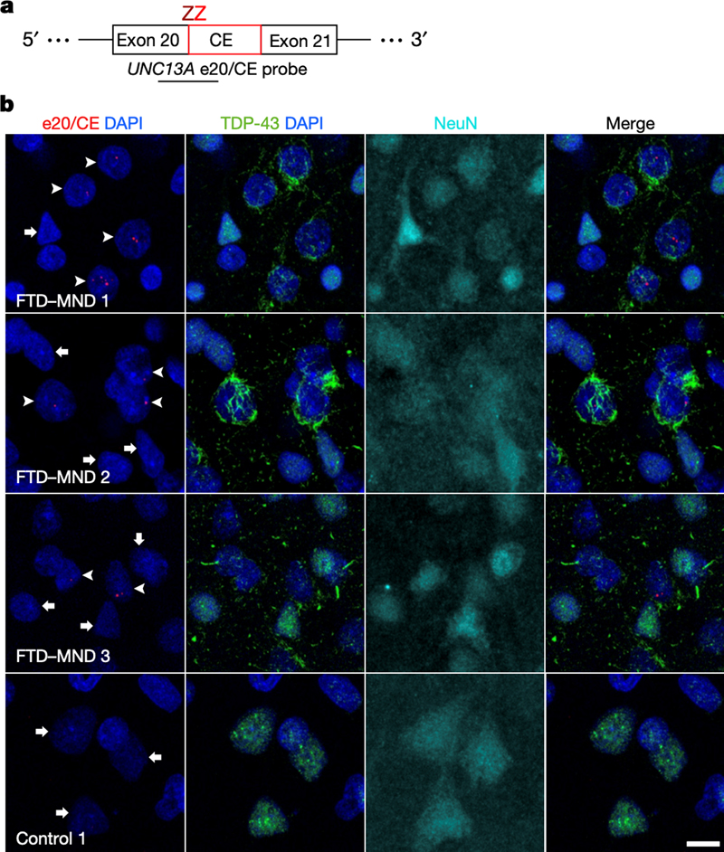 Figure 4. UNC13A cryptic splicing is associated with loss of nuclear TDP-43 in patients with FTD and motor neuron disease. a. BaseScope probe design b. in situ hybridization using the UNC13A e20/CE probe, combined with immunofluorescence for TDP-43 and NeuN illustrating the presence of UNC13A CE (arrowheads) in neurons showing depletion of nuclear TDP-43. Scale bar, 10 μm. (Reproduced from Ma et al., 2022 under the creative commons license). 5. A surprising turn in frontotemporal dementia FTLD is the third most common neurodegenerative disorder after Alzheimer’s and Parkinson’s disease, with one major FTLD subtype characterized by pathological neuronal inclusions with TDP-43 immunoreactivity. Determining the atomic structure of these inclusions is a high research priority given the expected utility for facilitating biomarker and therapeutic discovery. Using cryogenic electron microscopy (cryo-EM), three independent groups addressed this gap in knowledge with all making an astonishing discovery: the extracted amyloid fibrils were composed of fragments of transmembrane protein 106B (TMEM106B), a lysosomal membrane protein previously implicated as a genetic risk factor for FTLD-TDP (Chang et al., 2022; Jiang et al., 2022; Schweighauser et al., 2022). While details among the studies differ, in essence the inclusions consist of a normally intraluminal 135-residue fragment of TMEM106B that is likely shed before assuming this abnormal configuration. The aggregates, which are derived from the C-terminus, were likely missed in previous studies because most antisera target the N-terminus of the molecule. These findings raise a flood of new questions about TMEM106B and abnormal lysosomal activity in neurodegeneration.