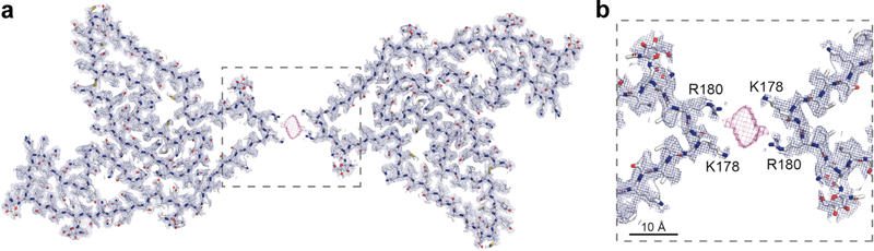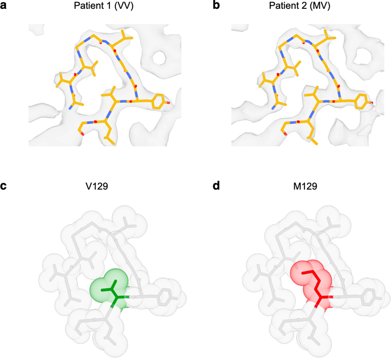 Figure 5. TMEM106B cryo-EM doublet fibril. (Reproduced with permission from Chang et al., 2022 under the creative commons license). 6. The cryo-EM structure of prion protein amyloid There are a number of dominantly inherited prion protein (PrP) amyloidoses, including Gerstmann-Sträussler-Scheinker disease (GSS), PrP cerebral amyloid angiopathy, and prion amyloidosis with variable phenotypes. All are caused by mutations in the prion protein gene (PRNP). GSS is notable in that typical extracellular deposits made of PrP amyloid (APrP) are associated with abnormal intraneuronal tau inclusions that are identical to those observed in classical AD, which raises fundamental questions as to how amyloid-beta causes tau pathology and whether there are shared pathogenic mechanisms. Understanding the atomic structure of the APrP has the potential to shed light on how extracellular amyloid deposition in general might trigger tau pathology independently and facilitate the development of positron emission tomography (PET) tracers as well as therapeutic interventions for prion diseases. This is possible with cryo-EM. In a study entitled “Cryo-EM structures of prion protein filaments from Gerstmann-Sträussler-Scheinker disease”, investigators studied brain fibrils isolated from two patients with the PRNP F198S mutation (Hallinan et al., 2022). One patient was homozygous (VV) and the other homozygous (VM) at codon 129, which is known to influence disease onset and progression, allowed them to compare this important clinically relevant difference. Looking at the first VV homozygous patient, they found that the APrP was polymorphic, with mainly two, three or four intertwined protofilaments (Figure 6). The structures better delineated the location of the V residue at codon 129, which is buried deep in the amyloid core, protected from solvent exchange and tightly packed, suggesting that substitution with a methionine would affect fibril formation. These new structural data human brain APrP filaments have the potential to open new avenues for diagnosis and treatment of prion disease.